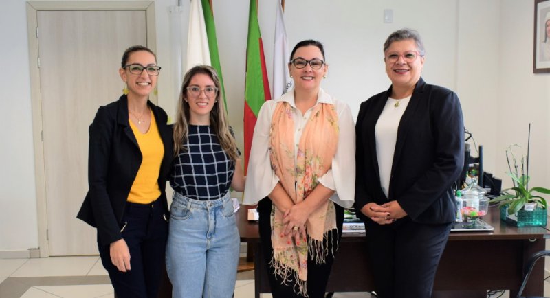 Foto: reunião na Reitoria do IFFar teve a participação de assistente administrativa da Unicred, coordenadora de Projetos Sociais do IFFar, reitora do IFFar e gerente do Instituto Unicred