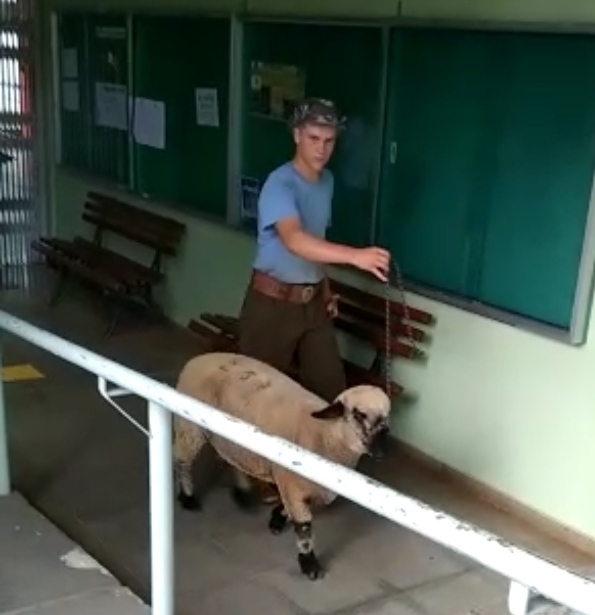 O Professor Rui Pilar (responsável pelo Laboratório de Ensino, Pesquisa, Extensão e Produção em Ovinocultura – LEPEP de Ovinocultura) orienta o aluno monitor Felipe Braz (responsável pelo treinamento do animal, cuidados durante o evento e condução na pista de julgamento), os servidores César Telles (responsável pelo manejo e alimentação do animal no campus) com o auxílio do Técnico em agropecuária Rodrigo Backer da Rosa e o Médico Veterinário Douglas Pedro e os parabeniza a equipe do LEPEP de Ovinocultura pelo excelente trabalho quem vêm realizando.