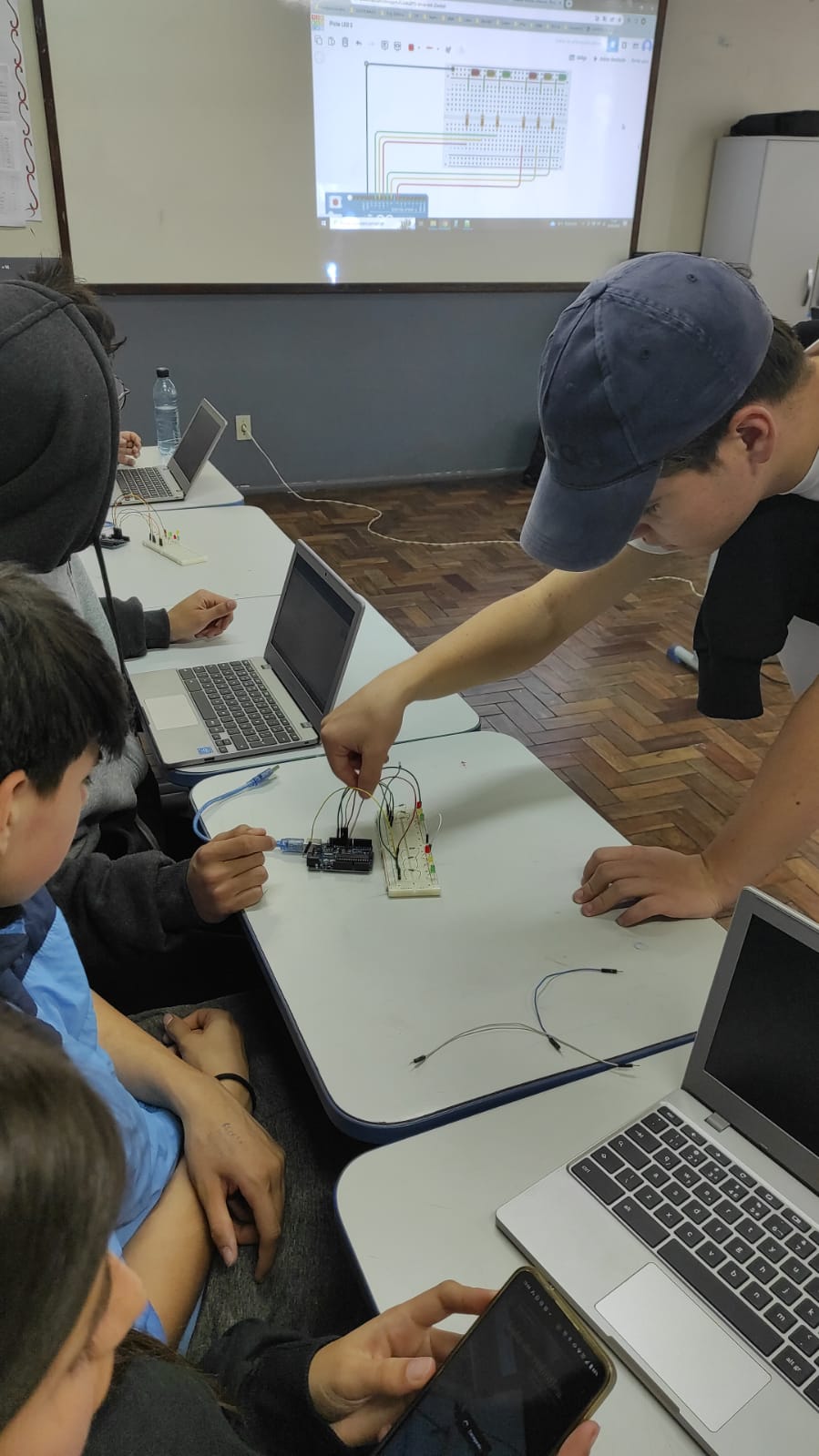 Os estudantes do IFFar receberam uma formação intensiva sobre programação em Arduino e desempenharam um papel fundamental como monitores durante a oferta das disciplinas. Eles foram responsáveis por ajudar os alunos da oficina a realizarem as atividades práticas propostas em sala de aula.