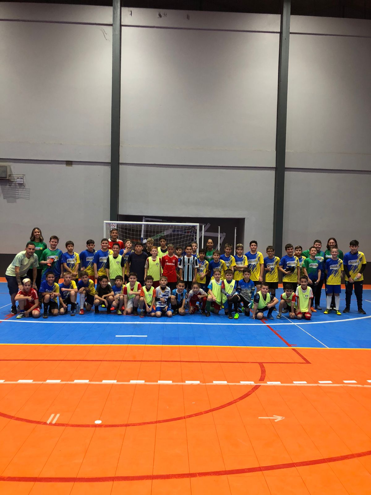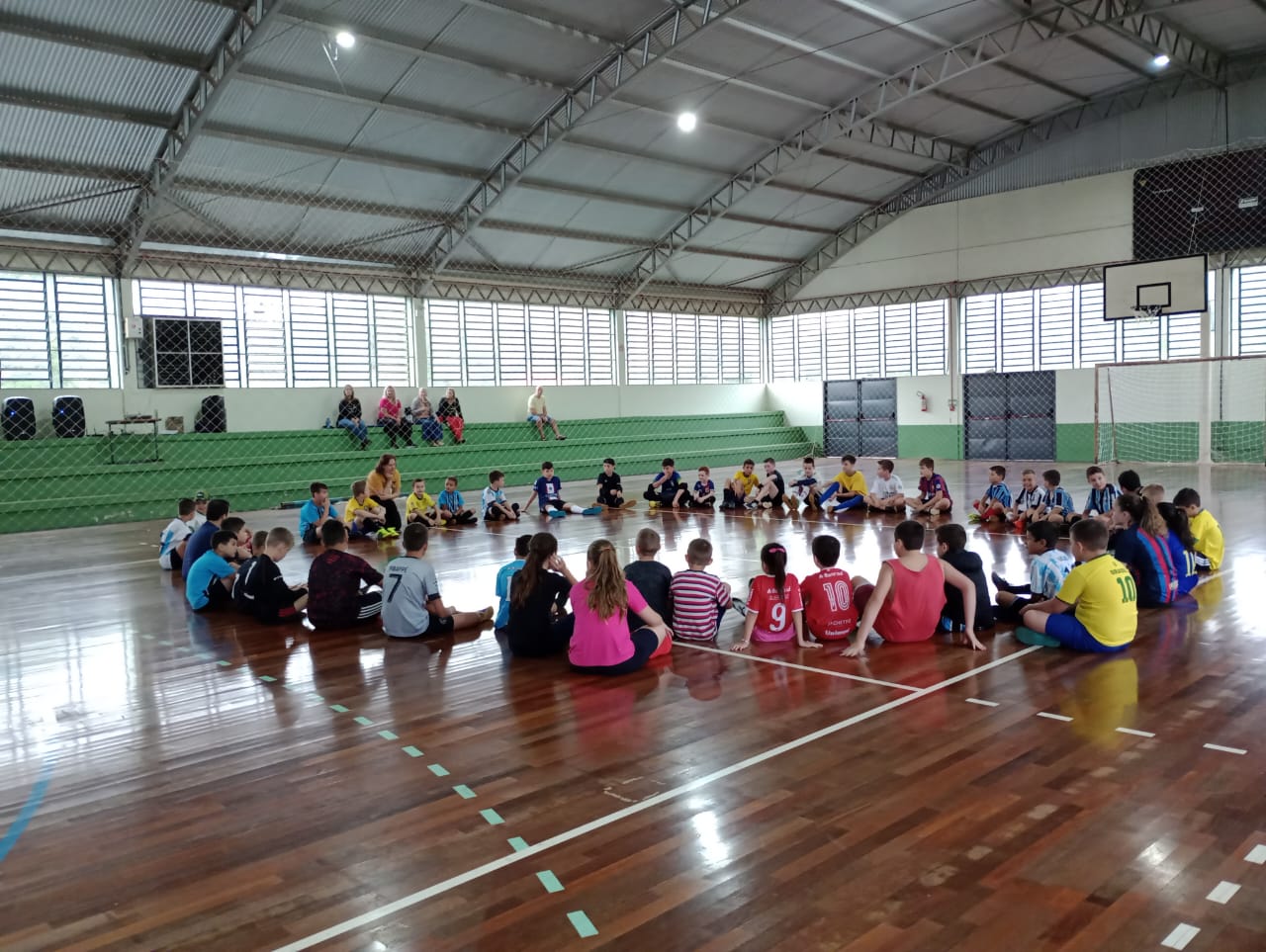 Foto: crianças participam do projeto Academia e Futebol no ginásio do Campus Panambi
