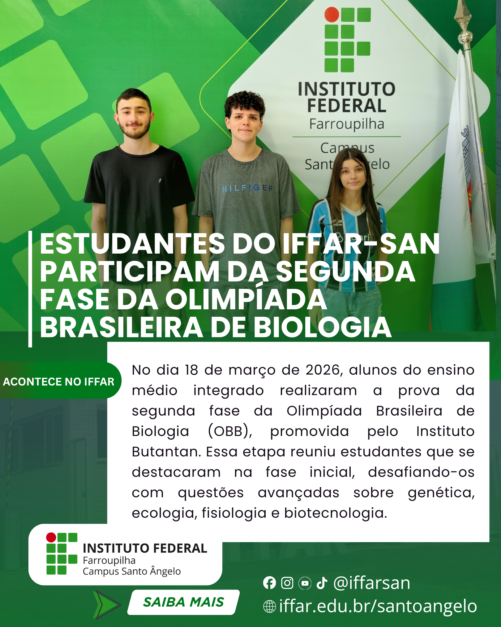 Alunos dos cursos técnicos integrados ao ensino médio integrado do Instituto Federal Farroupilha – Campus Santo Ângelo (IFFar-SAn) realizaram, no dia 18 de março de 2026, a prova da segunda fase da Olimpíada Brasileira de Biologia (OBB), promovida pelo Instituto Butantan.