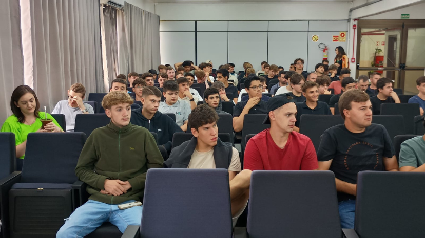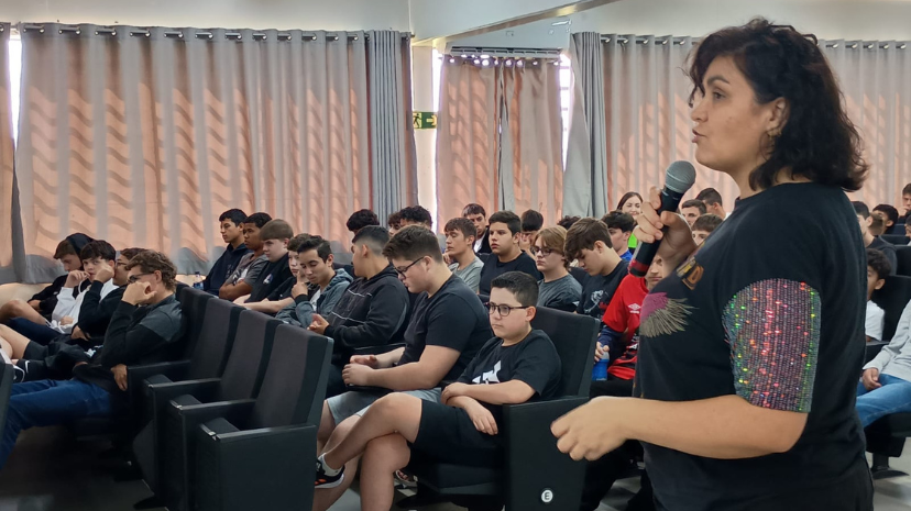 Para garantir a participação de todos os estudantes, a programação foi dividida em dois espaços e abordagens distintas, contemplando reflexões específicas. No auditório, os estudantes participaram de um debate conduzido pela psicóloga Nairana Marczewski de Melo, que trouxe discussões sobre masculinidade tóxica e violência contra a mulher. Durante sua fala, destacou como as construções sociais influenciam o comportamento masculino, muitas vezes reforçando padrões de agressividade, poder e dominação. Também abordou como essas práticas podem se iniciar ainda na juventude e evoluir para formas mais graves de violência, refletidas nos altos índices de feminicídio no Brasil.