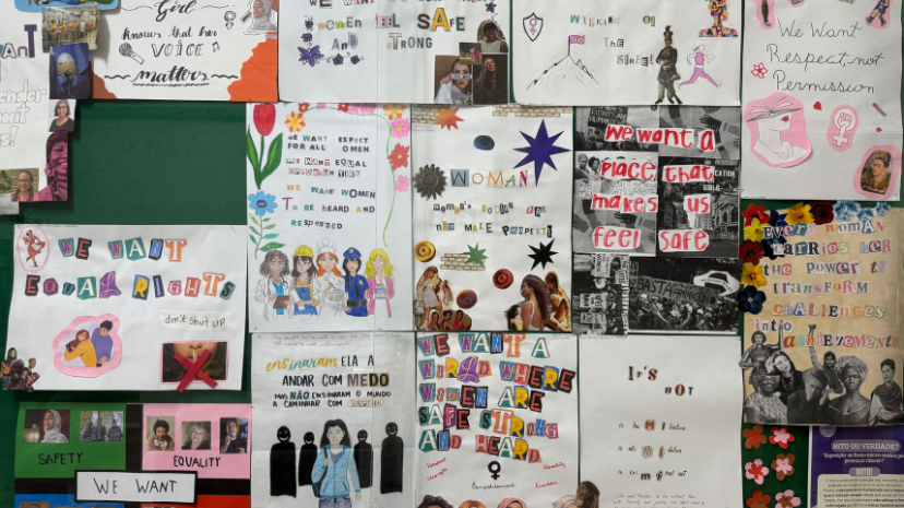 Como culminância das atividades, os alunos das turmas TAI09, TAI10, TI04, TI05 e TED02 produziram pôsteres em língua inglesa com mensagens de conscientização e valorização das mulheres. A proposta orientou que os trabalhos trouxessem uma frase principal iniciada por “We want…”, expressando ideias relacionadas a direitos, igualdade, segurança e empoderamento feminino.