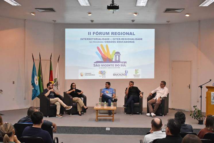 O 2º Fórum Regional das Cidades Educadoras ocorreu no dia 15 de abril, no Auditório Central do Campus São Vicente do Sul. O evento foi promovido por meio de uma parceria entre IFFar e Prefeitura Municipal de São Vicente do Sul, tendo a participação de gestores públicos, educadores e sociedade civil. Seu propósito principal foi o de fortalecer as ações desenvolvidas pelos municípios participantes do programa, avaliar e renovar metas assumidas, além de construir estratégias conjuntas para o avanço regional.