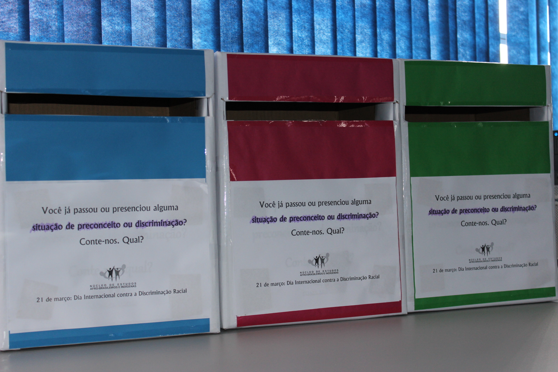 Ao final da sessão, integrantes do NEABI propuseram uma atividade alusiva ao Dia Internacional contra a Discriminação Racial (21 de março), que deverá contar com a participação de toda comunidade interna do IFFar. No Campus há três caixas coletoras de relatos de situações de “preconceito ou discriminação”, vivenciadas dentro ou fora da escola. As contribuições podem ser anônimas e servirão como sugestões para as próximas ações do Núcleo.