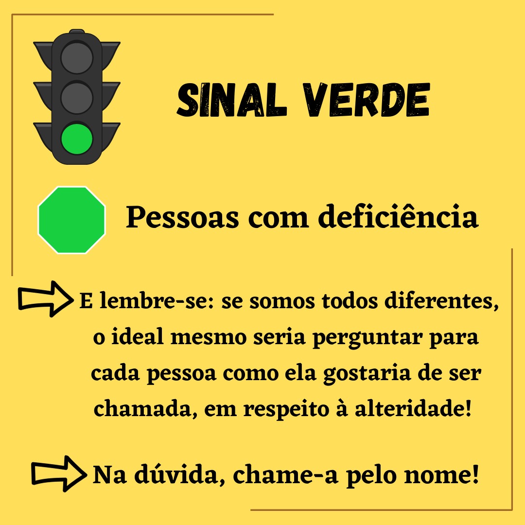 #Pratodosverem Sequência de 5 cards com fundo amarelo. O primeiro possui a logo do IFFar no canto superior esquerdo, onde se lê; 21 de setembro, Dia Nacional de Luta da Pessoa Com Deficiência. No segundo card lê-se: Um grande passo que podemos dar é refletirmos sobre algumas terminologias e expressões usadas no nosso cotidiano, que podem causar grande dor em quem as escuta. Terceiro e quarto cards possuem a figura de um semáforo com sinal vermelho indicando palavras ou expressões que não devem ser utilizadas em referência a Pessoas com deficiência. Quinto card, possui figura do semáforo com sinal verde com a escrita: Somos todos diferentes, o ideal seria perguntar para cada pessoa como ela gostaria de ser chamada, em respeito à alteridade! E: na dúvida, chame-a pelo nome!