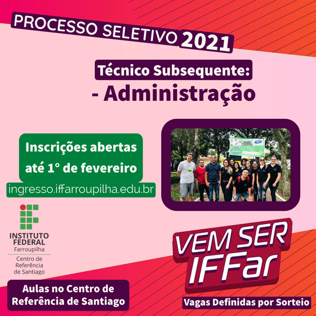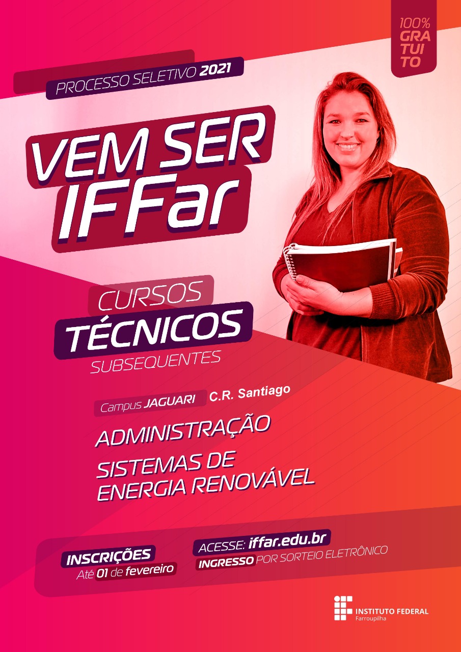 Neste ano, em virtude da pandemia, as vagas serão definidas por sorteio. Então, não perca o período de inscrição que está aberto até o dia 1° de fevereiro através do site ingresso.iffarroupilha.edu.br