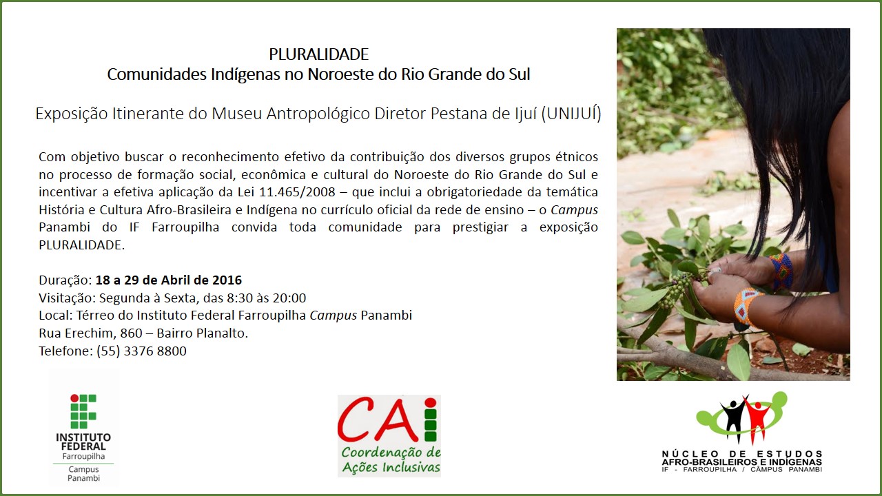 Na quinzena em que se comemora o Dia do Índio (19 de abril), o Campus Panambi do IF Farroupilha recebe a exposição itinerante “Pluralidade: Comunidades Indígenas no Noroeste do RS”, do Museu Antropológico Diretor Pestana, da Unijuí.