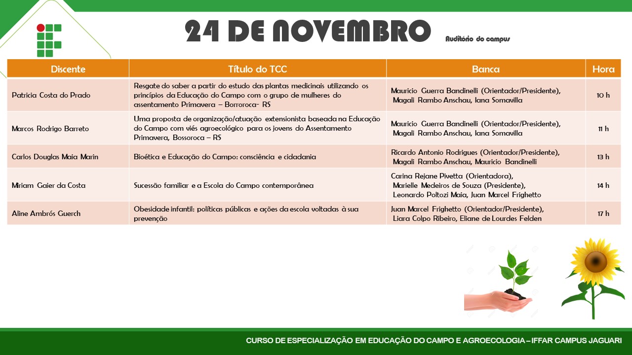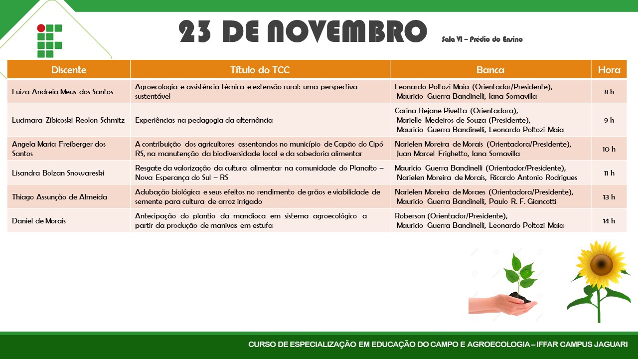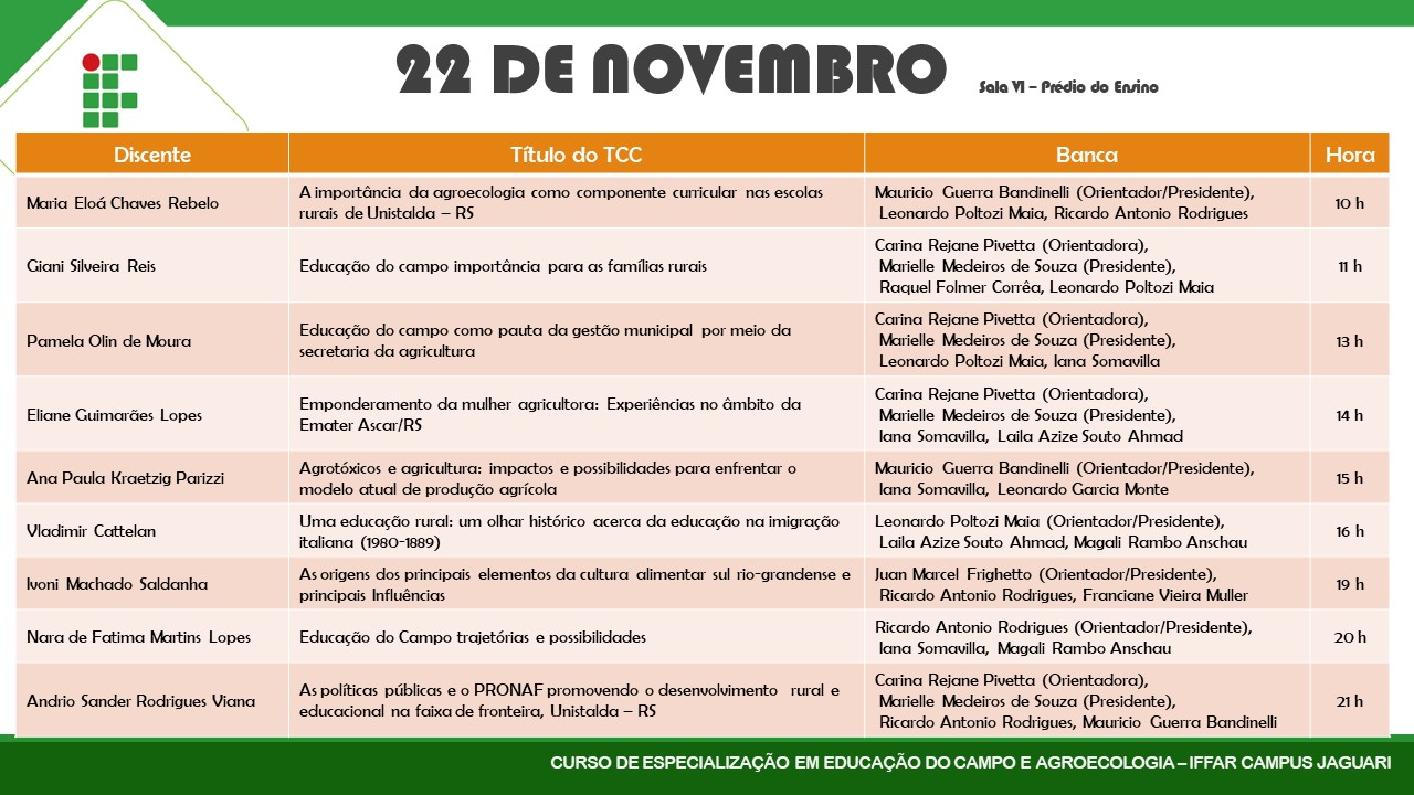 Nesta semana (22, 23 e 24 de novembro) a primeira turma do Curso de Especialização em Educação do Campo e Agroecologia estará defendendo seus Trabalhos de Conclusão de Curso.