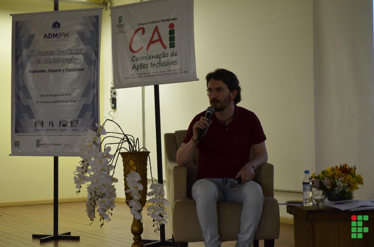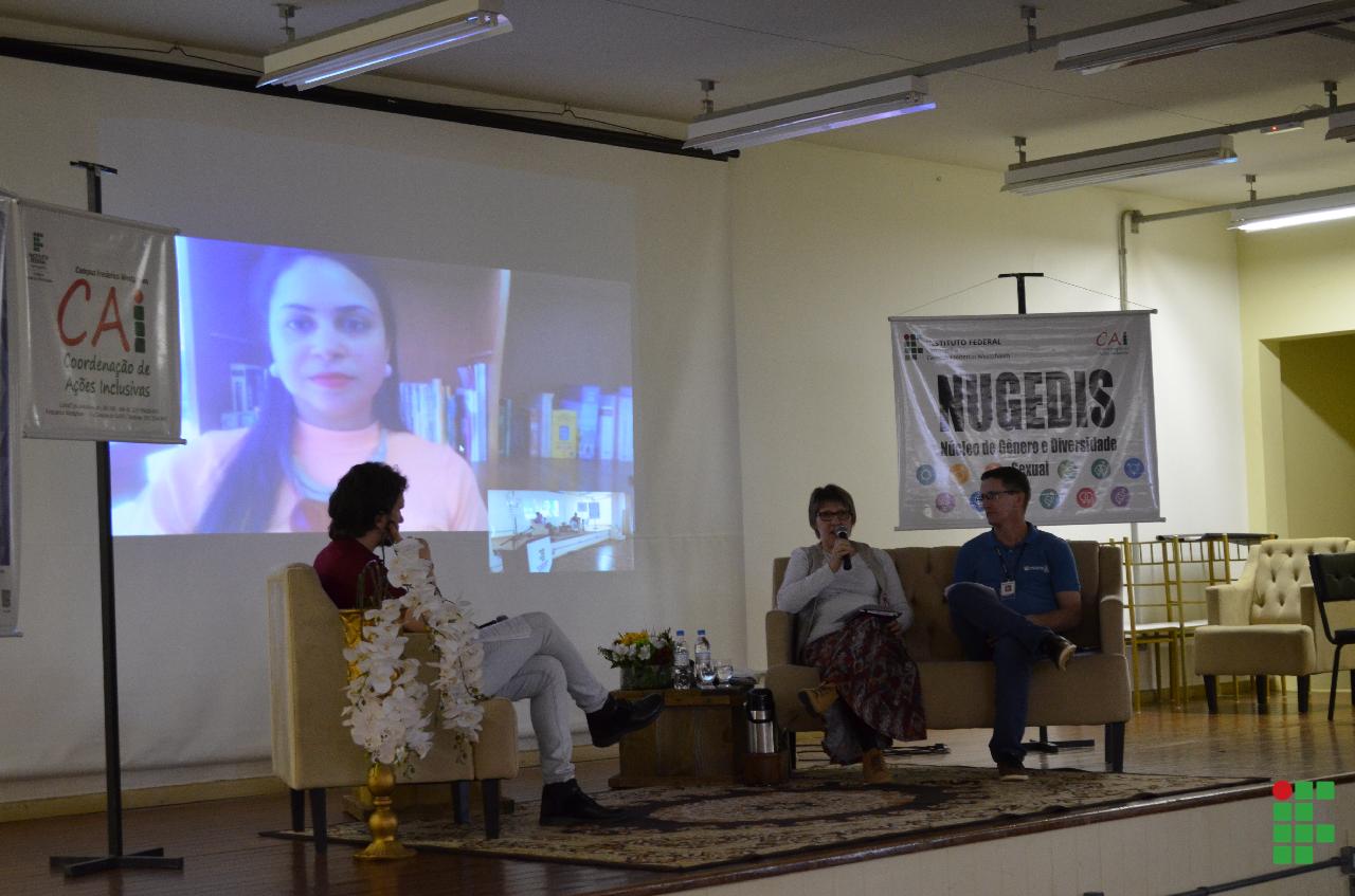 Para o momento de debate, após a exibição do curta, o Professor do IFFar/FW William Nunes foi convidado para executar a mediação, ao lado dos(as) convidados(as) a Advogada Amanda Rodrigues, o extensionista rural da ASCAR/EMATER-RS Flavio Vogt e Salete Maglia, a qual atua em projetos de extensão com mulheres rurais por meio do CETAP, é membra da diretoria da ADMAU e participa do coletivo feminista Maria Frederica.