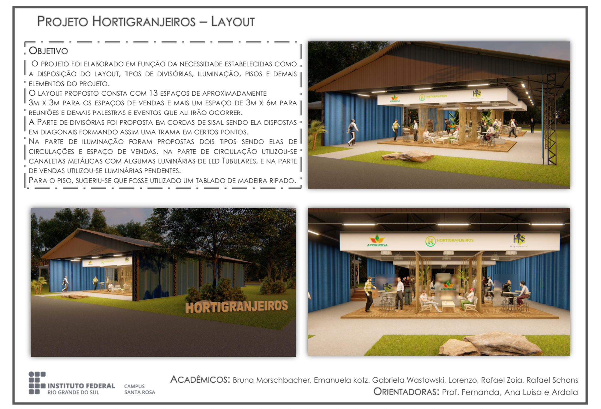Na quarta-feira (18), alunos do curso de Arquitetura e Urbanismo reuniram-se com integrantes da comissão organizadora do 33º Encontro Estadual de Hortigranjeiros para apresentar as propostas de layout e interiores criadas para o ambiente do Pavilhão de Startups do evento. O encontro teve a participação da diretora-geral do IFFar – Campus Santa Rosa, Renata Rotta; da coordenadora do curso de Arquitetura e Urbanismo, Fernanda Conrad Rigo; do vice-presidente do 33º Encontro Estadual de Hortigranjeiros, Marcos Servat, acompanhado do coordenador-geral, Vanio Heimerdinger e da assessora de imprensa, Deise Froelich; além dos representantes dos grupos de acadêmicos que desenvolveram os projetos.