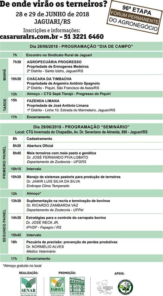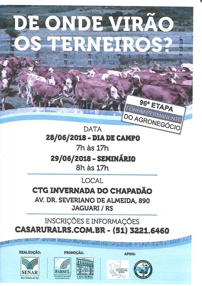 Nos dias 28 e 29 de junho o município de Jaguari recebe a 96ª etapa do Fórum Permanente do Agronegócio – ‘De onde virão os terneiros’, iniciativa do Sistema Farsul, Serviço Nacional de Aprendizagem Rural (SENAR-RS) e Casa Rural, com apoio de várias entidades da região, entre elas o IFFar – Campus Jaguari e o Sindicato Rural de Jaguari.