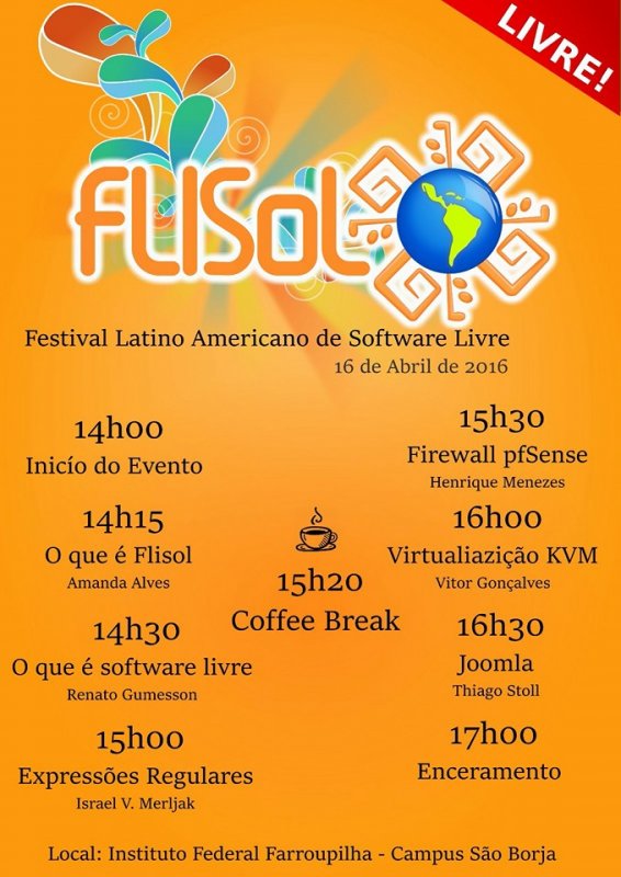 Neste sábado (16), acontece mais uma edição do Festival Latino Americano de Instalação de Software Livre - FLISOL, no IF Farroupilha - Campus São Borja. O Flisol tem por objetivo promover o uso de Software Livre, mostrando ao público em geral sua filosofia, abrangência, avanços e desenvolvimento. Para alcançar estes objetivos, diversas comunidades locais de Software Livre (em cada país/cidade/localidade), organizam simultâneamente eventos em que se instala, de maneira gratuita e totalmente legal, Software Livre nos computadores dos participantes. Além disso, paralelamente acontecem palestras, apresentações e workshops, sobre temas locais, nacionais e latino-americanos sobre Software Livre, em toda a sua expressão: artística, acadêmica, empresarial e social. O evento acontece no hall do prédio ensino, das 14 às 18 horas, deste Sábado. Os participantes terão ajuda para instalar softwares livres como, as distribuições Linux - Ubuntu, Mint, Debian e softwares como o Gimp, LibreOffice e Firefox. O evento é gratuito e aberto à comunidade. Os interessados podem levar seus computadores pessoais para instalação de softwares livres que desejarem, além de poder assistir e participar das atividades previstas no evento.