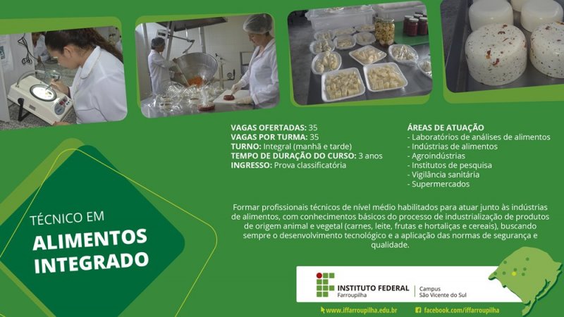Uma das novidades do Campus São Vicente do Sul neste Processo Seletivo 2019 para os Cursos Integrados é a abertura da primeira turma de Técnico em Alimentos: