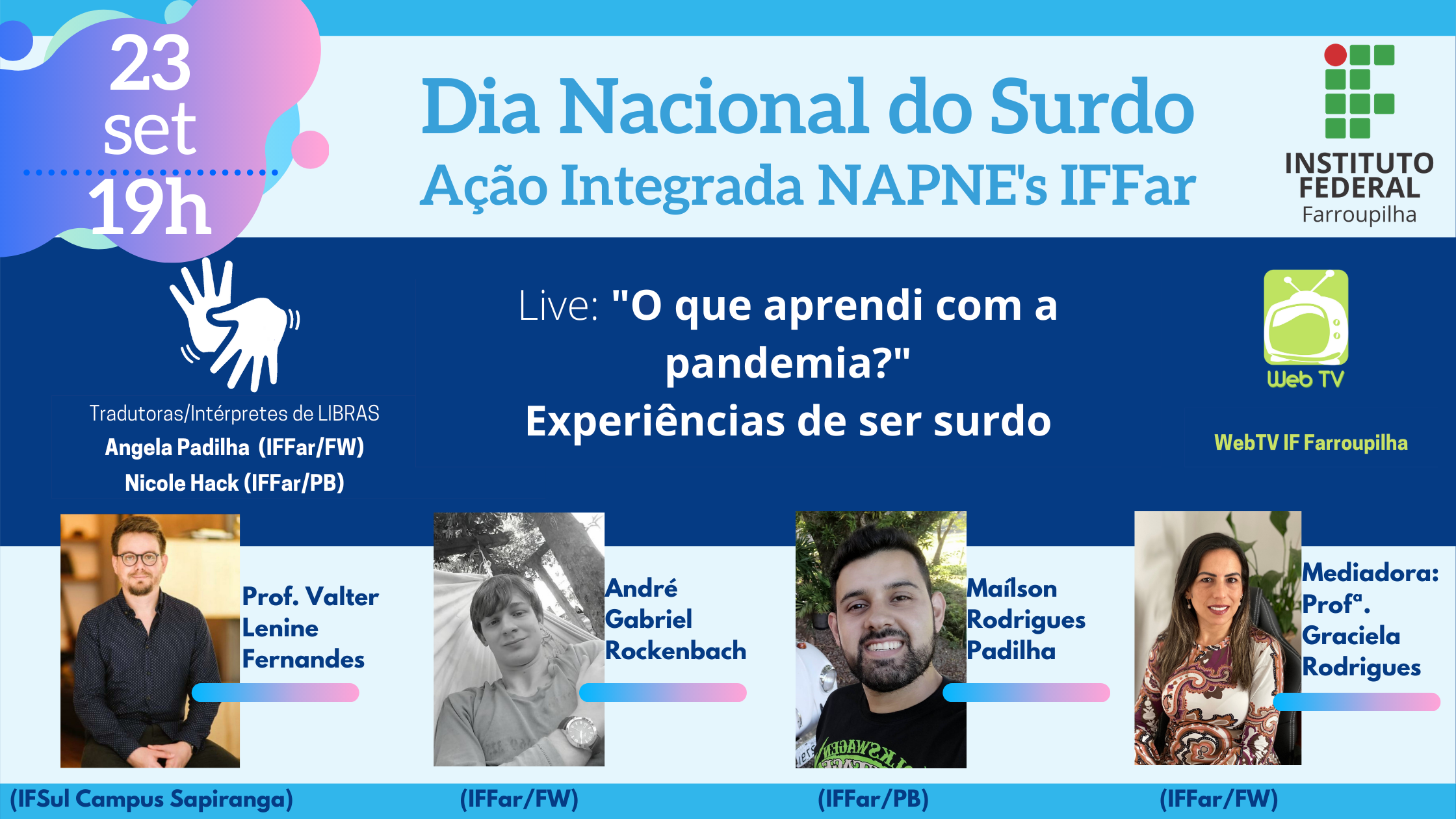 Na próxima quarta -feira, 23 de setembro, às 19h, teremos uma live alusiva ao Dia Nacional da Pessoa Surda, que é comemorado no dia 26 de setembro. O tema será “O que aprendi com a pandemia? Experiências de ser surdo". Trata-se de uma ação integrada dos Núcleos de Apoio a Pessoas com Necessidades Especiais (NAPNE's) do IFFar.