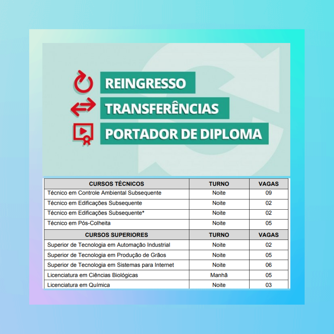 Se você é nosso aluno e quer mudar de curso ou campi, ou se você quer ingressar no IF Farroupilha, esta pode ser a sua chance. As inscrições para transferências, reingresso e ingresso de portador de diploma no IFFar vão de 19 a 23 de junho. Conheça as vagas e saiba como participar.