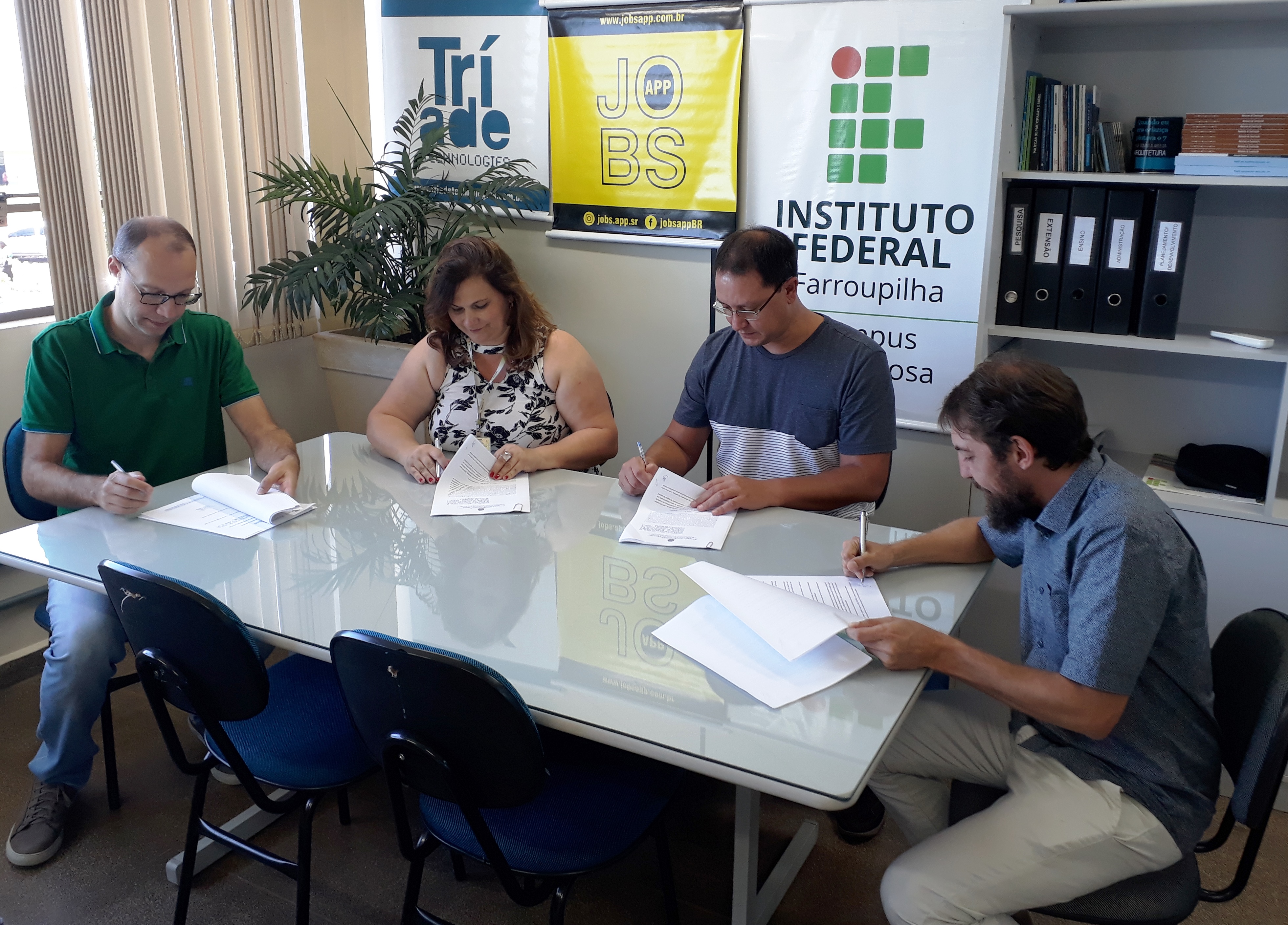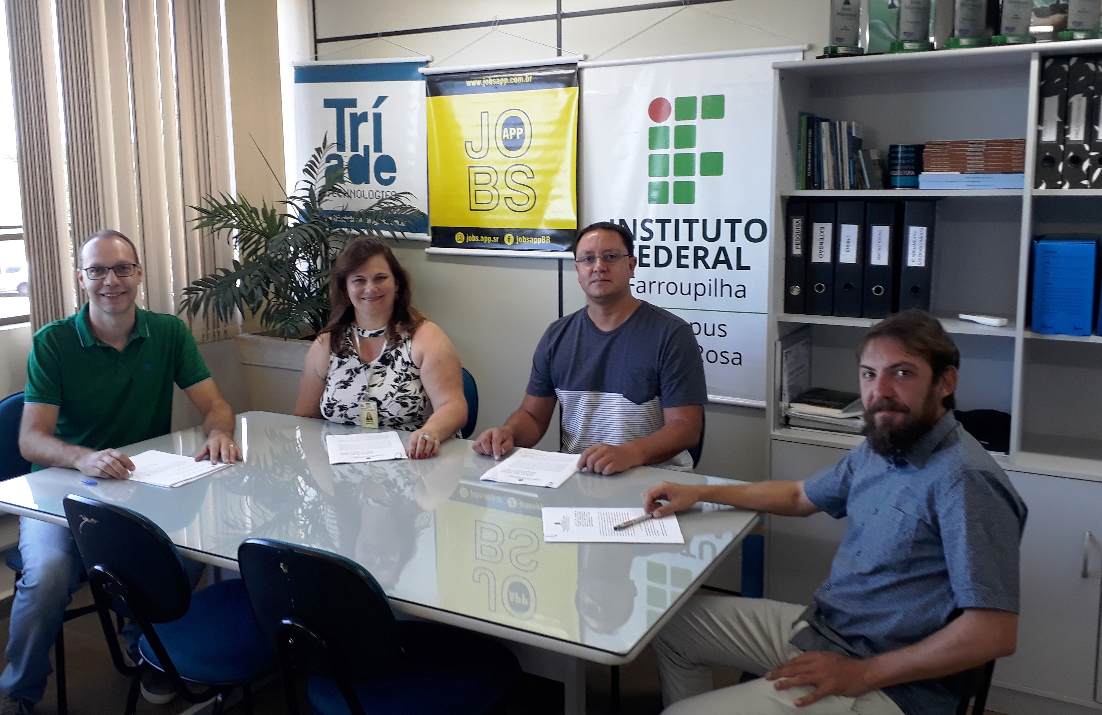 Participaram da reunião de formalização da assinatura do contrato, realizada no gabinete da direção, a diretora-geral substituta, professora Analice Marchezan; o coordenador do Núcleo de Inovação Tecnológica – NIT, professor Rodrigo Soder; e os representantes da empresa Triade Technologies, Ricardo Cademartori e Ike Becker. A empresa tem como produto principal o JobsApp, uma plataforma digital para quem procura ou oferta serviços, como encanador, mecânico, eletricista, pedreiro, dog-walker, costureiro, limpador de piscina e etc.
