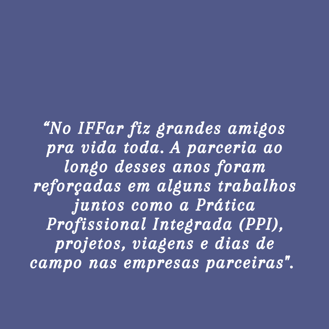 “No IFFar fiz grandes amigos pra vida toda. A parceria ao longo desses anos foram reforçadas em alguns trabalhos juntos como a Prática Profissional Integrada (PPI), projetos, viagens e dias de campo nas empresas parceiras.