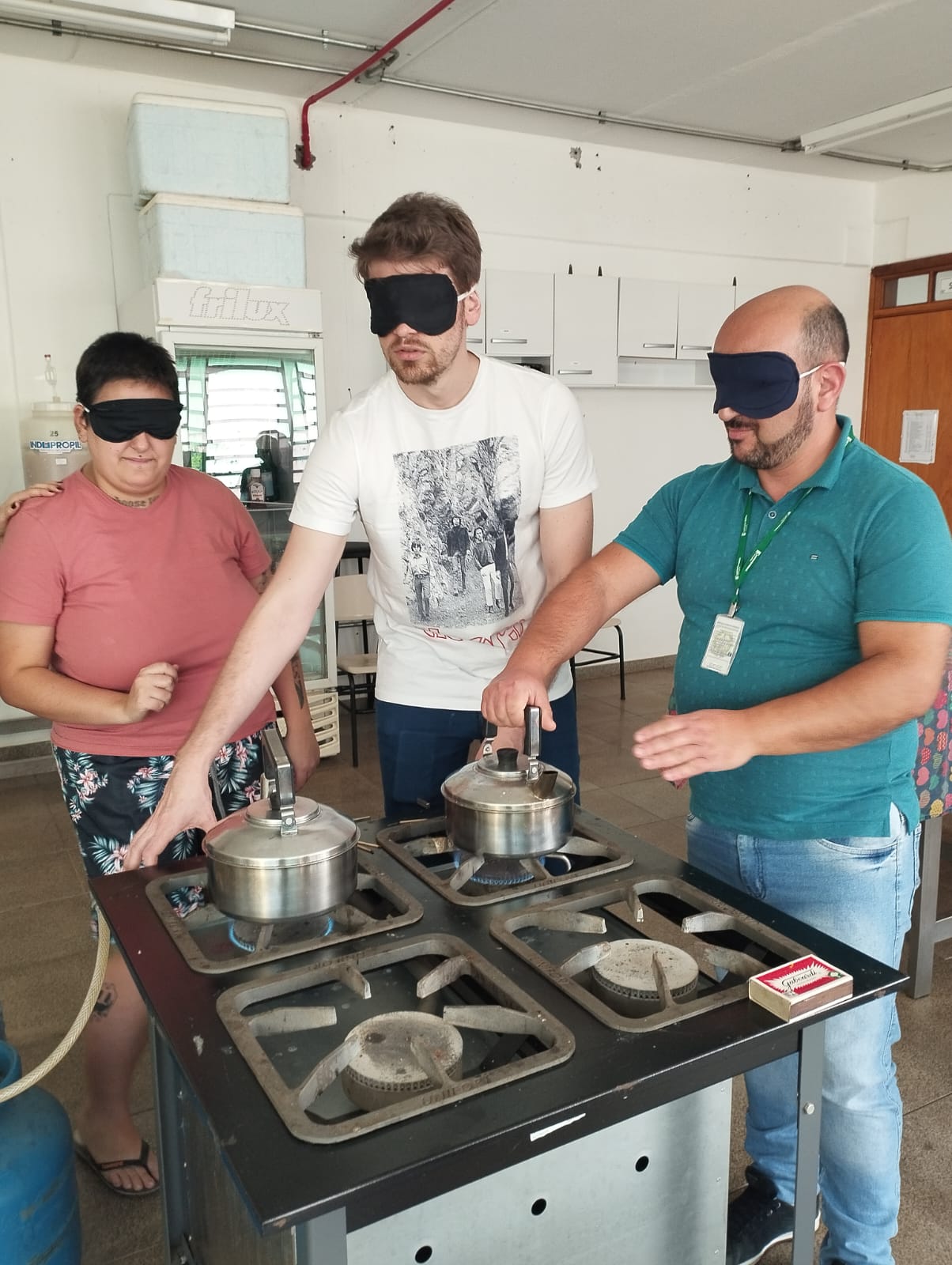 #Pratodosverem Sequência de quatro fotos, nas quais temos: 1) três participantes do curso em pé, com os olhos vendados, manuseando uma chaleira diante de um fogão industrial; 2) duas pessoas vendadas, sentadas diante de um computador; 3) participantes do curso sentados, em uma sala de aula, atentos à explanação de Juliano; 4) dez participantes do curso estão reunidos e sorriem na direção da câmera fotográfica.