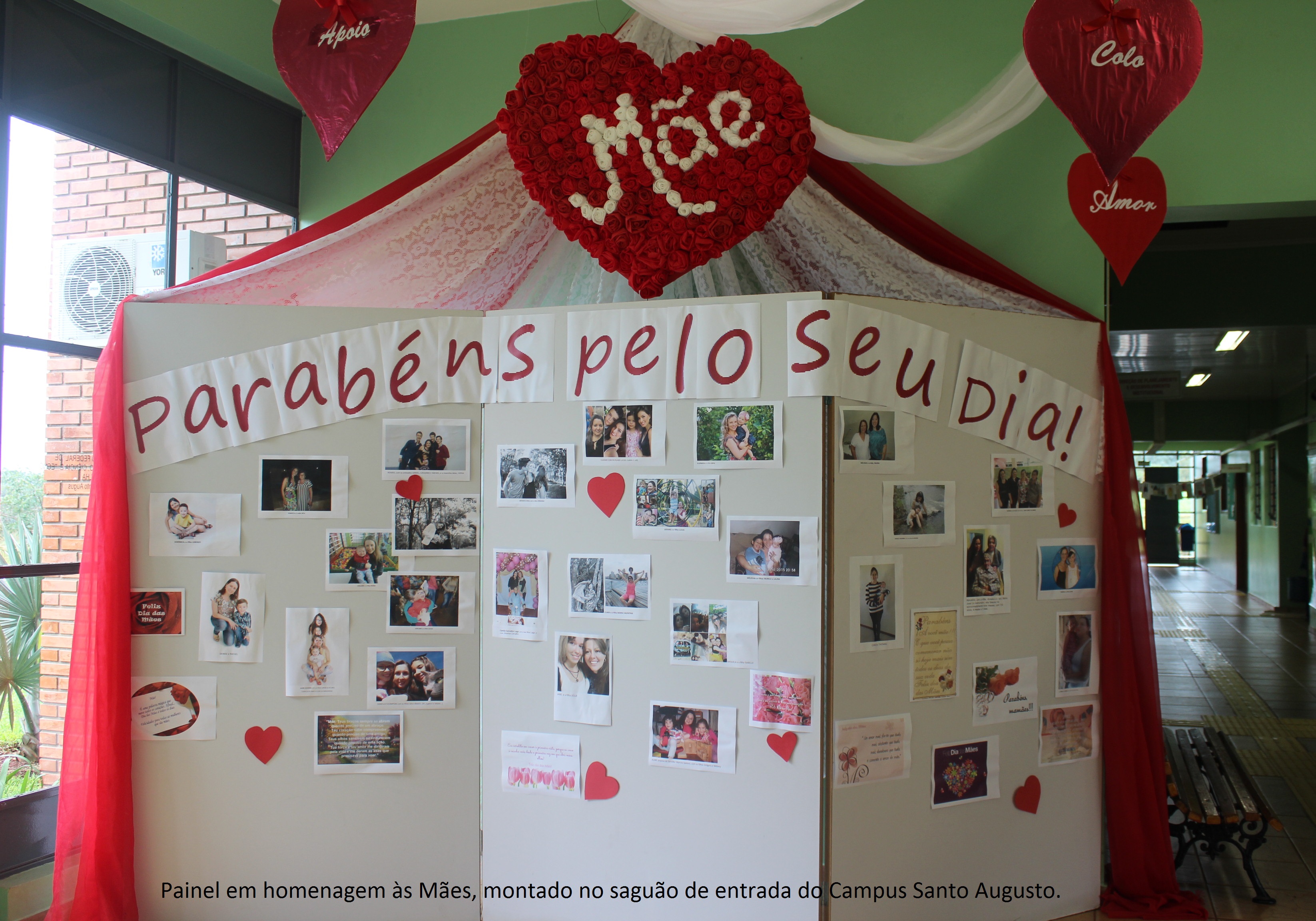 O Dia das Mães foi comemorado no Campus Santo Augusto com um painel de fotos em homenagem a todas as mães, montado pela Produtora Cultural, Stela Paris, e com um mimo oferecido pela equipe diretiva, a cada uma das mamães que trabalham no Campus: um delicioso cupcake de chocolate com creme, juntamente com bela mensagem sobre esta data tão especial.