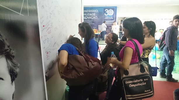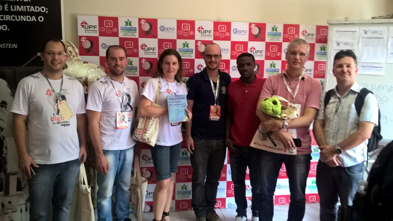 A participação dos alunos se deu de diferentes formas. Os acadêmicos puderam assistir a palestras, participar de oficinas, conhecer o Campus da UPF, interagir e trocar experiências sobre a temática do evento. Professores e alunos compartilham com Gilvan Vilarim, autor do Livro: Algoritmos: programação para iniciantes, a experiência do seu livro, que é utilizado em sala de aula nos cursos Técnico em Informática e Licenciatura em Computação no Campus Santo Augusto ((na foto, ele está ao lado do Professor Adão).