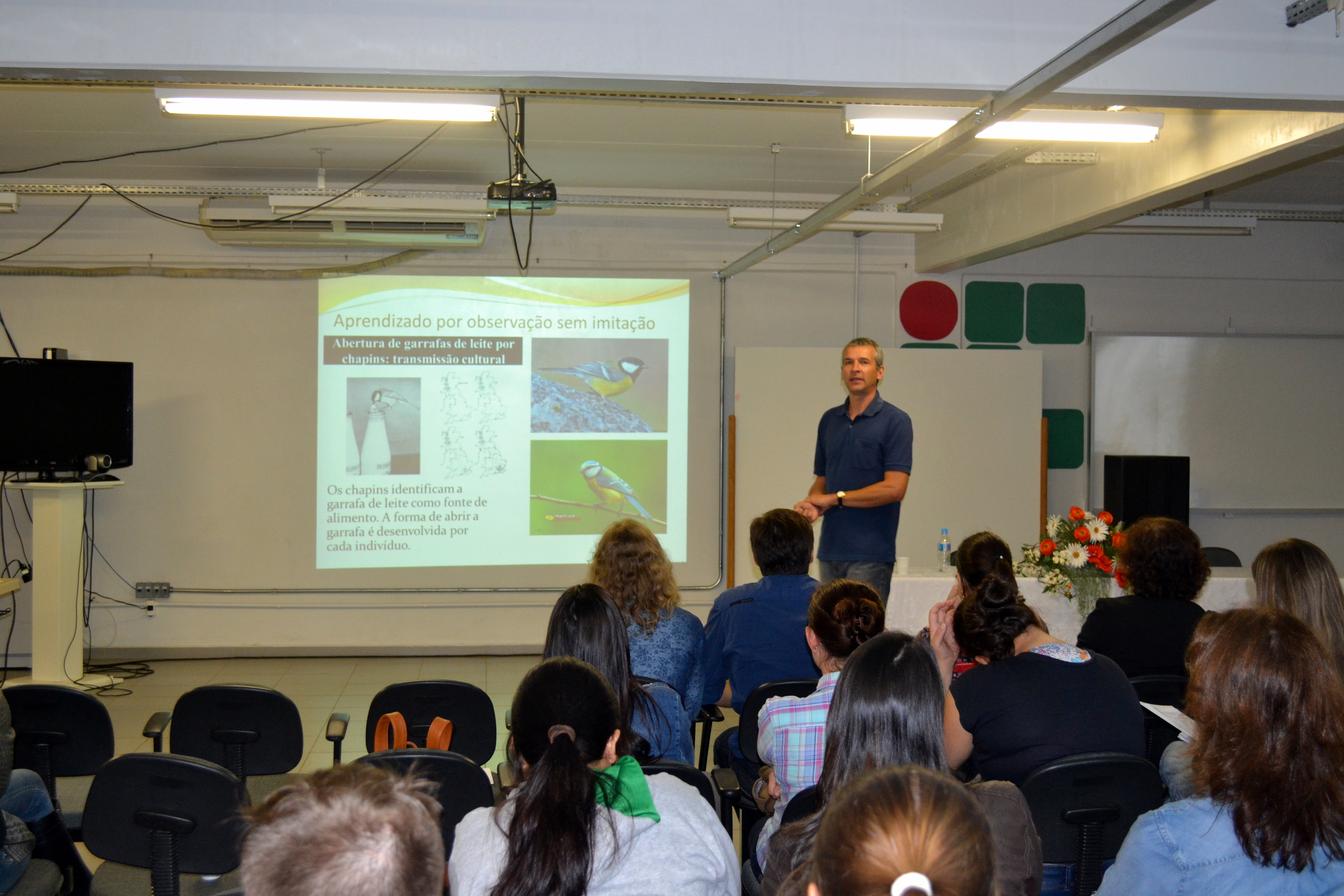 O tema abordado pelo palestrante foi "Uma nova forma de interpretar a evolução biológica". O Dr. Adriano foi professor do Campus Santa Rosa e um dos colaboradores para a implantação do curso de Licenciatura em Ciências Biológicas. "É um prazer retornar ao campus, rever alunos que fizeram os cursos técnicos e agora têm a oportunidade de cursar uma graduação aqui mesmo", disse ele.