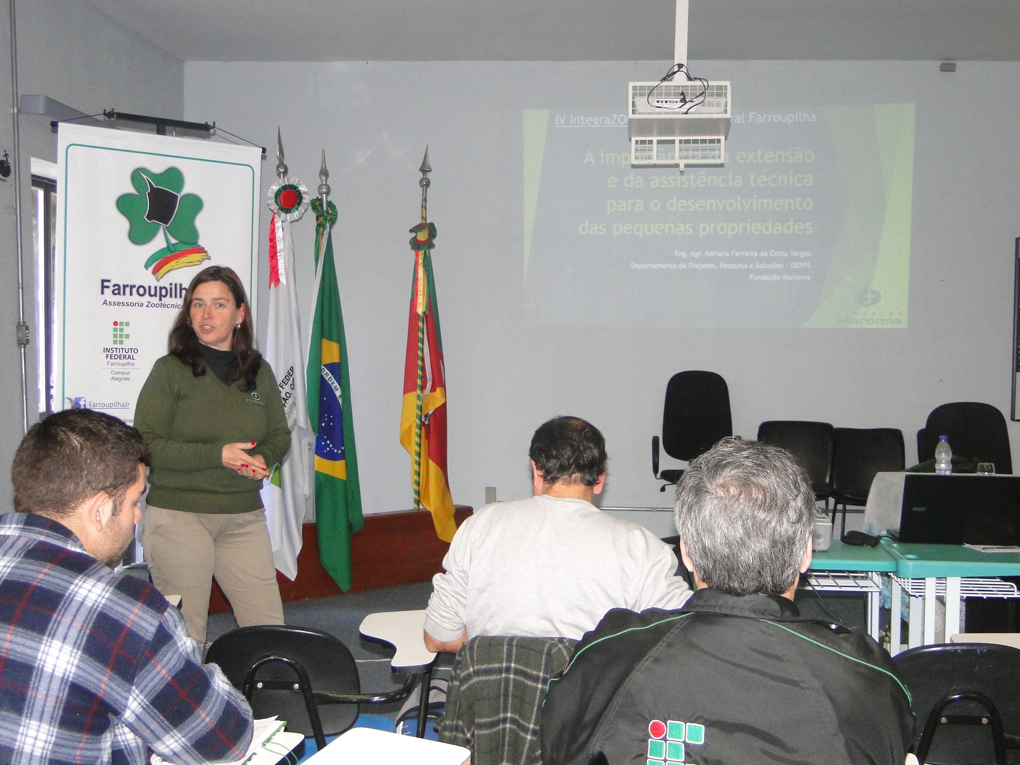 Nairele dos Santos Bilhalva, microempreendedora no ramo da bovinocultura leiteira de Alegrete, discorreu sobre a extensão rural e assistência técnica aos produtores do segmento lácteo regional. Na opinião da Zootecnista, a atividade leiteira configura grande oportunidade de atuação profissional possibilitando a permanência dos egressos da Instituição no município. Em sua abordagem, fez referência ao crescimento dessa atividade na fronteira oeste do Rio Grande do Sul e a sua relação com os novos postos de trabalho para os zootecnistas.
