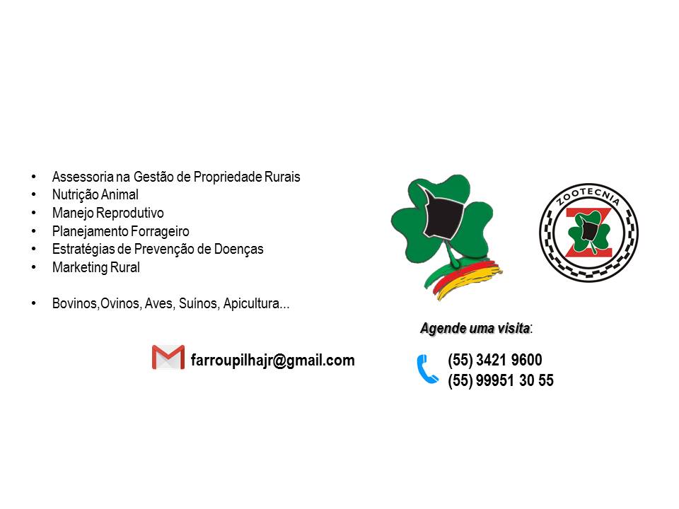 A empresa atua nas áreas de reprodução animal, nutrição animal, planejamento forrageiro, estratégias de prevenção de doenças, bovinocultura leiteira e de corte, melhoramento genético, suinocultura, avicultura, piscicultura, ovinoculura, marketing rural e assessoria na gestão de propriedades rurais. A equipe, com o apoio dos professores, atende diretamente nas propriedades rurais e também possui um espaço próprio no Campus do IFFar - Alegrete para assessorar seus clientes. Para receber o atendimento da Farroupilha Jr., o cilente deve ligar para a empresa e agendar uma visita. A empresa atende pelos telefones (55) 3421-9600, ramal 302, ou (55) 99951-3055. O contato também pode ser realizado através do e-mail Este endereço de email está sendo protegido de spambots. Você precisa do JavaScript ativado para vê-lo./.