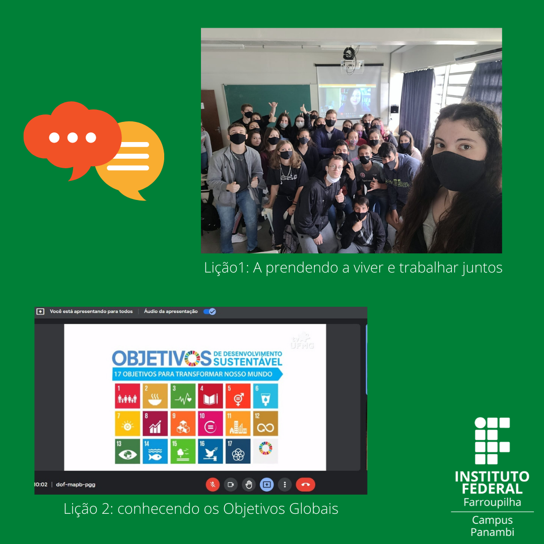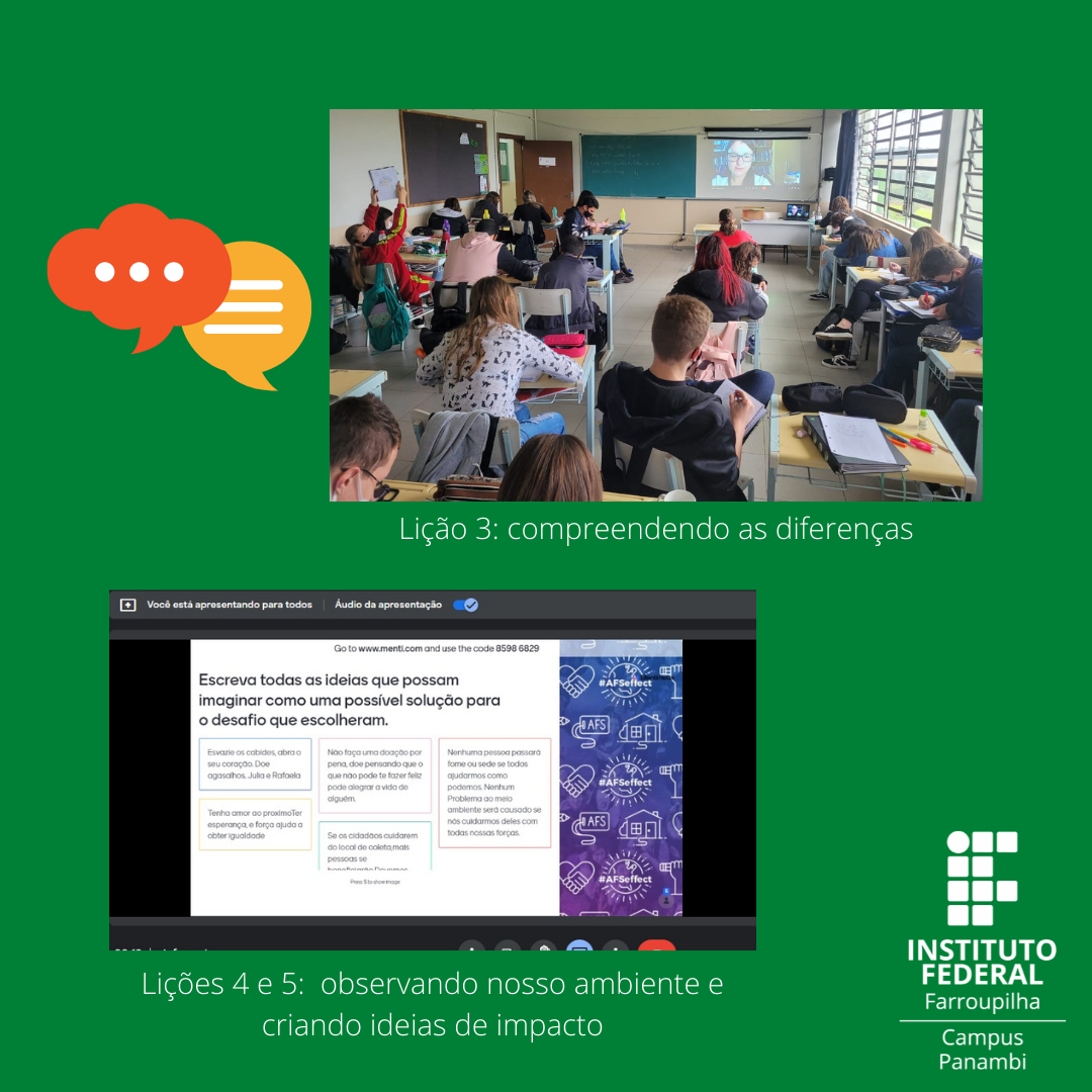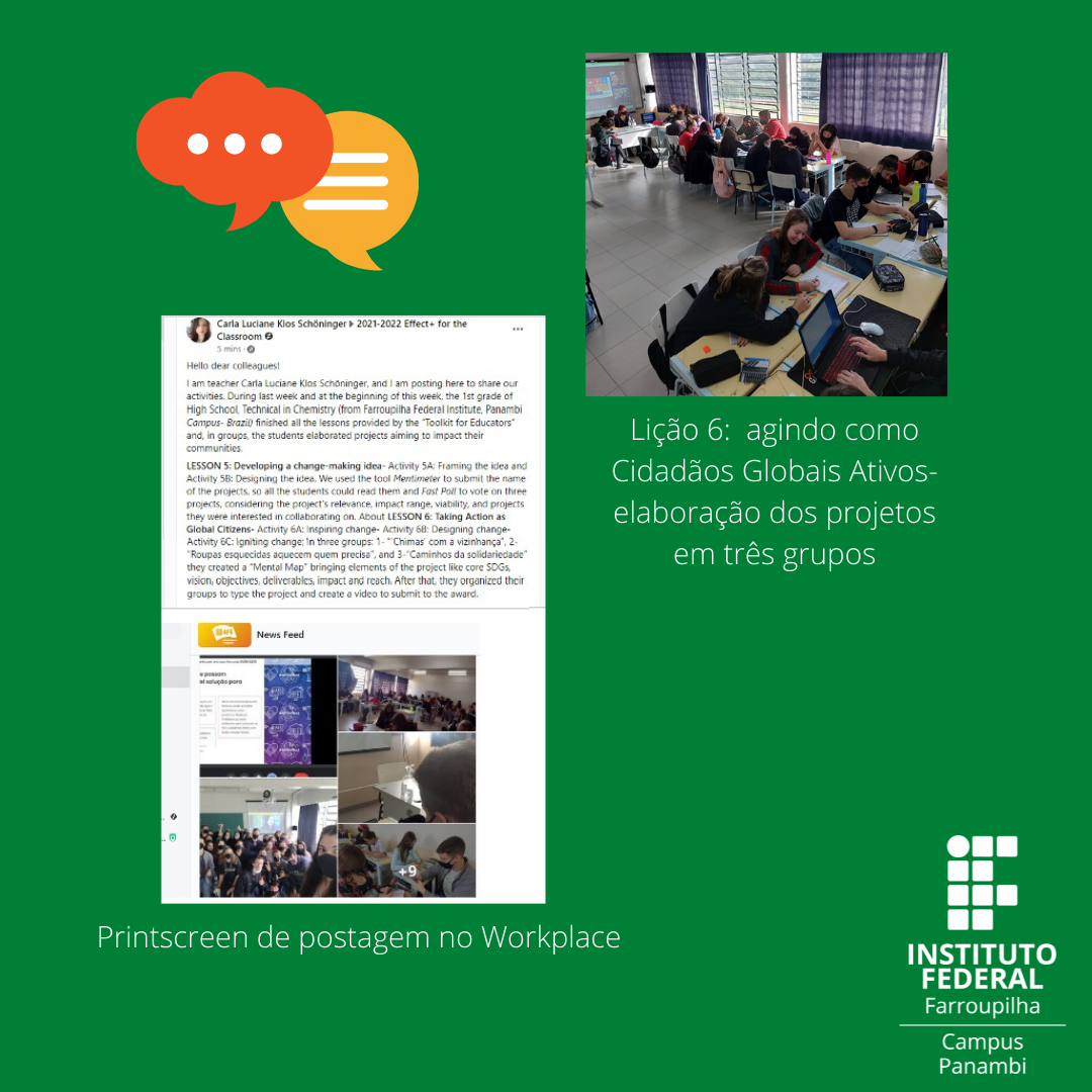 Neste sentido, nos meses de março e abril de 2022, 35 alunos do 1º ano, do curso Técnico em Química, participaram das seis lições sugeridas no material Toolkit for Educators. As lições foram: aprendendo a viver e trabalhar juntos, conhecendo os Objetivos Globais, compreendendo as diferenças, observando nosso ambiente, criando ideias de impacto e agindo como Cidadãos Globais Ativos. Tal abordagem ocorreu nas aulas de Português e Literatura brasileira e extraclasse. Os alunos mostraram-se interessados, engajados e participativos, compreendendo a realidade local, bem como seu papel como cidadãos globais ativos. A última lição resultou na elaboração de três projetos prevendo ações sociais; esses estarão concorrendo ao prêmio: Sir Cyril Taylor Young Leaders Award (YLA). Semanalmente a professora Carla realizou postagens no Workplace sobre as atividades desenvolvidas: https://afs-educators.workplace.com. Em breve cada aluno receberá certificado internacional de participação.
