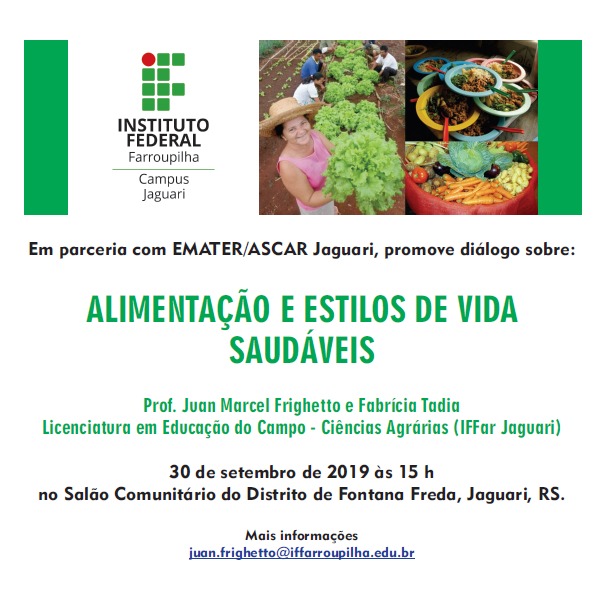O professor Juan Marcel Frighetto e a estudante Fabrícia Tadia, do Curso de Licenciatura em Educação do Campo - Ciências Agrárias realizaram no dia 30 de setembro, no Salão Comunitário do distrito de Fontana Freda, em Jaguari, um diálogo sobre "Alimentação e Estilos de Vida Saudáveis".