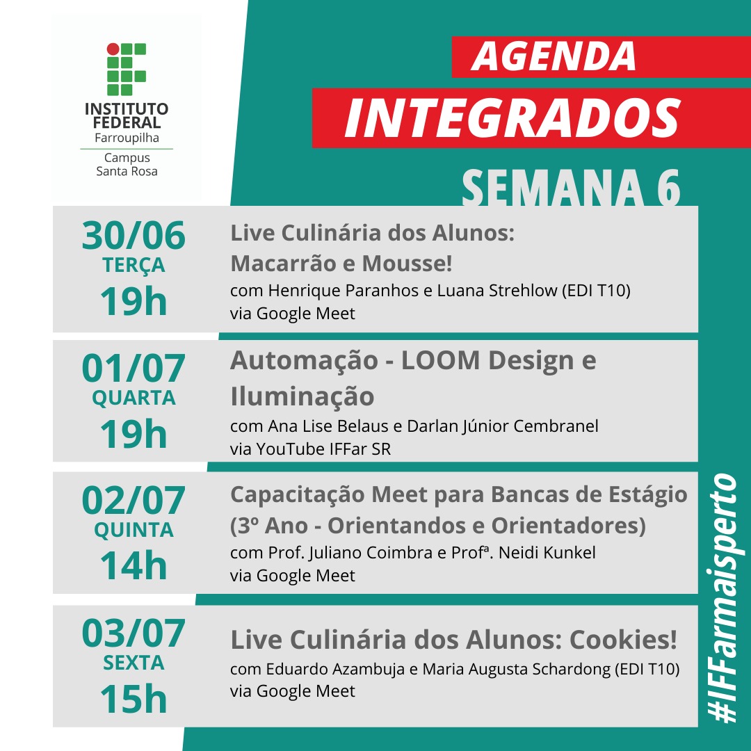 Confira o cronograma de atividades da semana de 29 de Junho a 03 de Julho para os cursos Técnicos e Superiores. O destaque da semana são as lives culinárias ministradas pelos alunos.