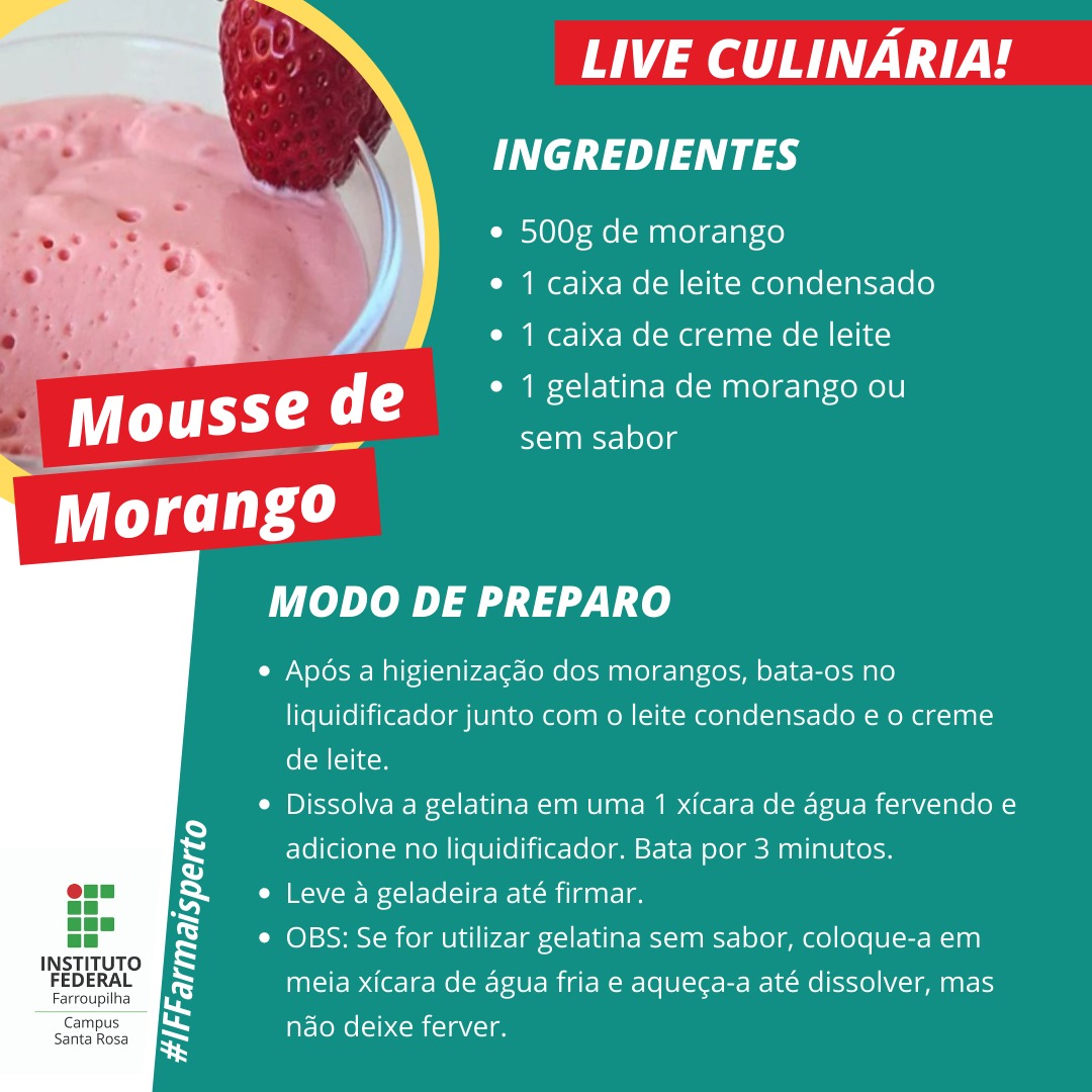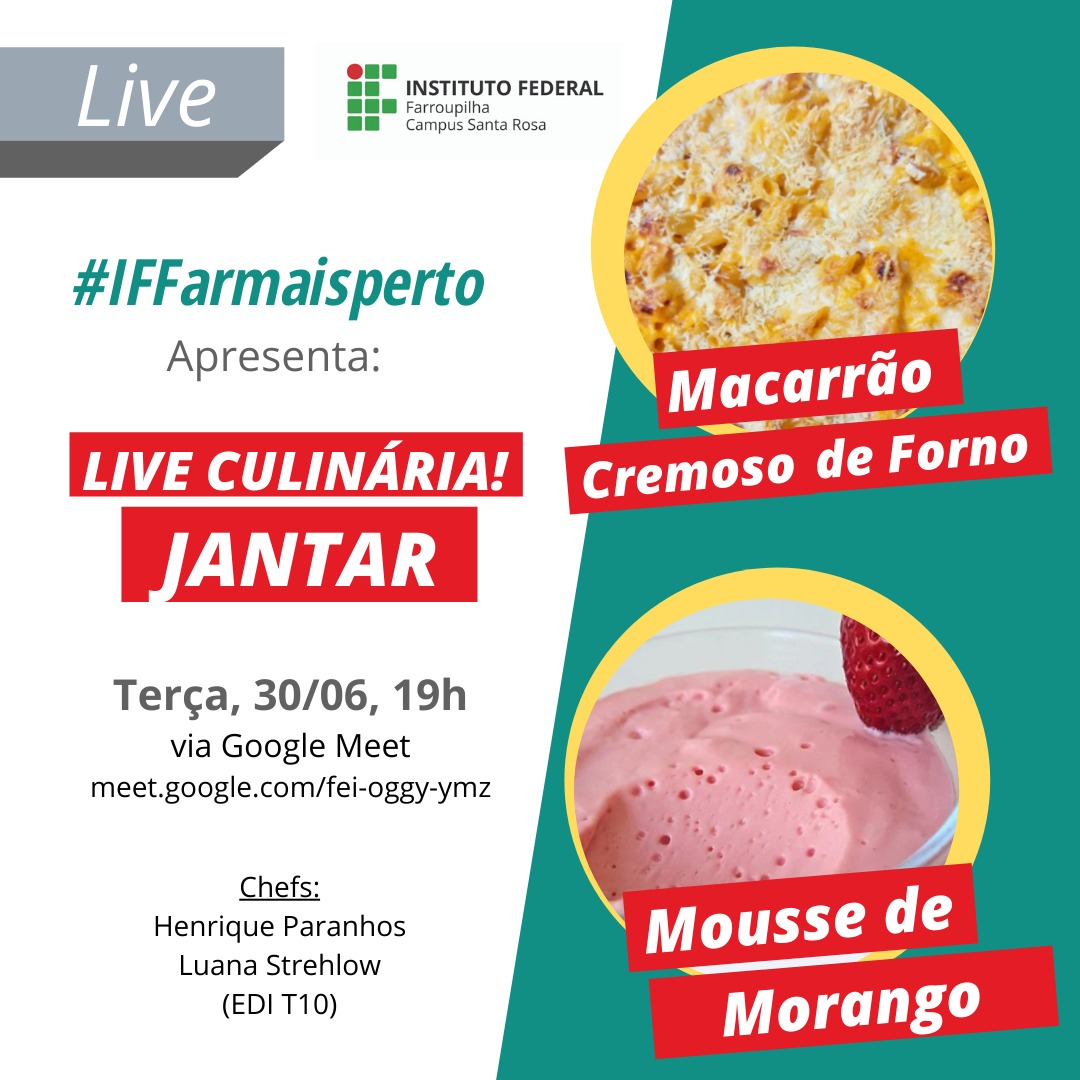 Terça, 30/06, 19h - Live Culinária dos alunos: Macarrão Cremoso de Forno e Mousse de Morango com os Chefs: Henrique Paranhos e Luana Strehlow, da Turma EDI T10.
