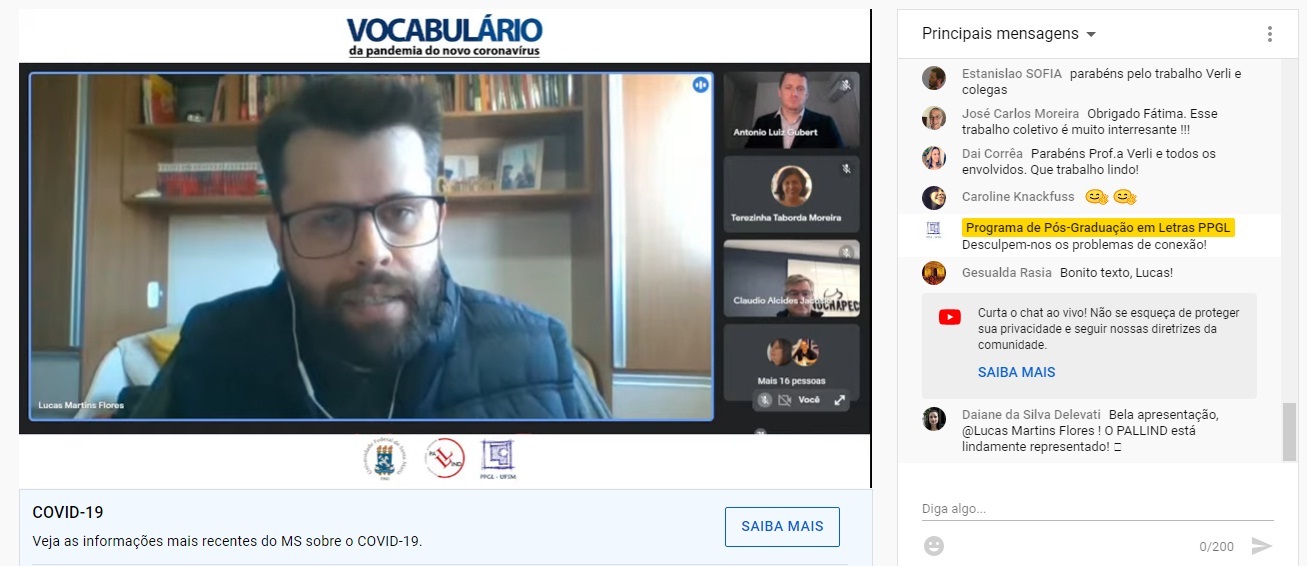 Os Professores Doutores Lucas Martins Flores e Graciele Turchetti de Oliveira do Campus Jaguari, juntamente com a Diretora de Ensino Marielle Medeiros de Souza e o Diretor de Pesquisa, Extensão e Produção Vinícius Soares Sturza participaram do lançamento do “Vocabulário da pandemia do novo coronavírus” no dia 2 de agosto de 2021, com transmissão no Youtube (https://www.youtube.com/watch?v=IiNur9uJ4AQ) do PPGL (Programa de Pós-Graduação em Letras), juntamente com o Grupo PALLIND/Laboratório Corpus/UFSM.