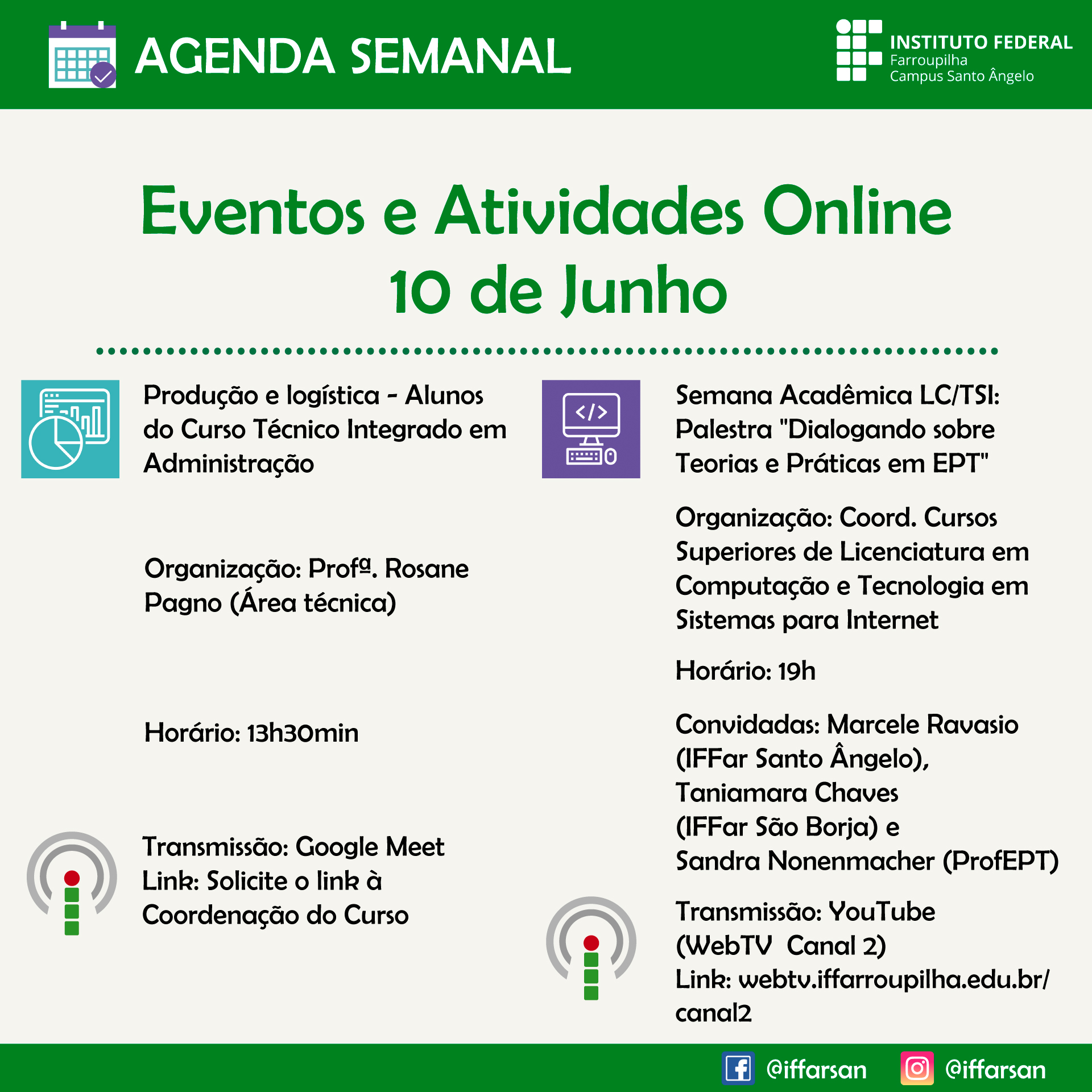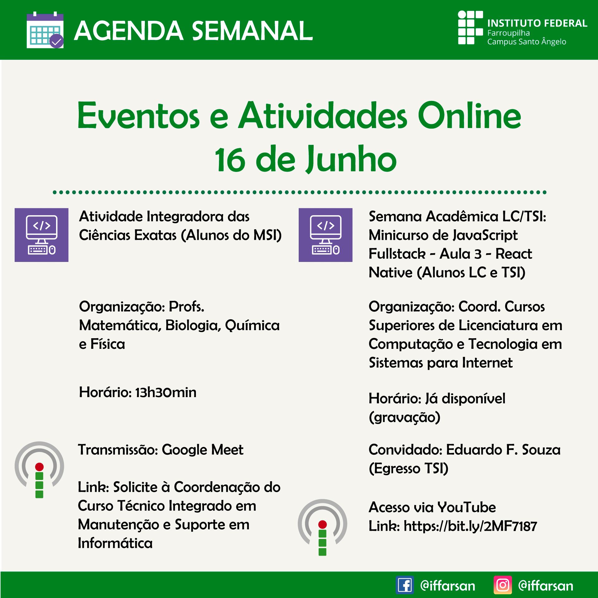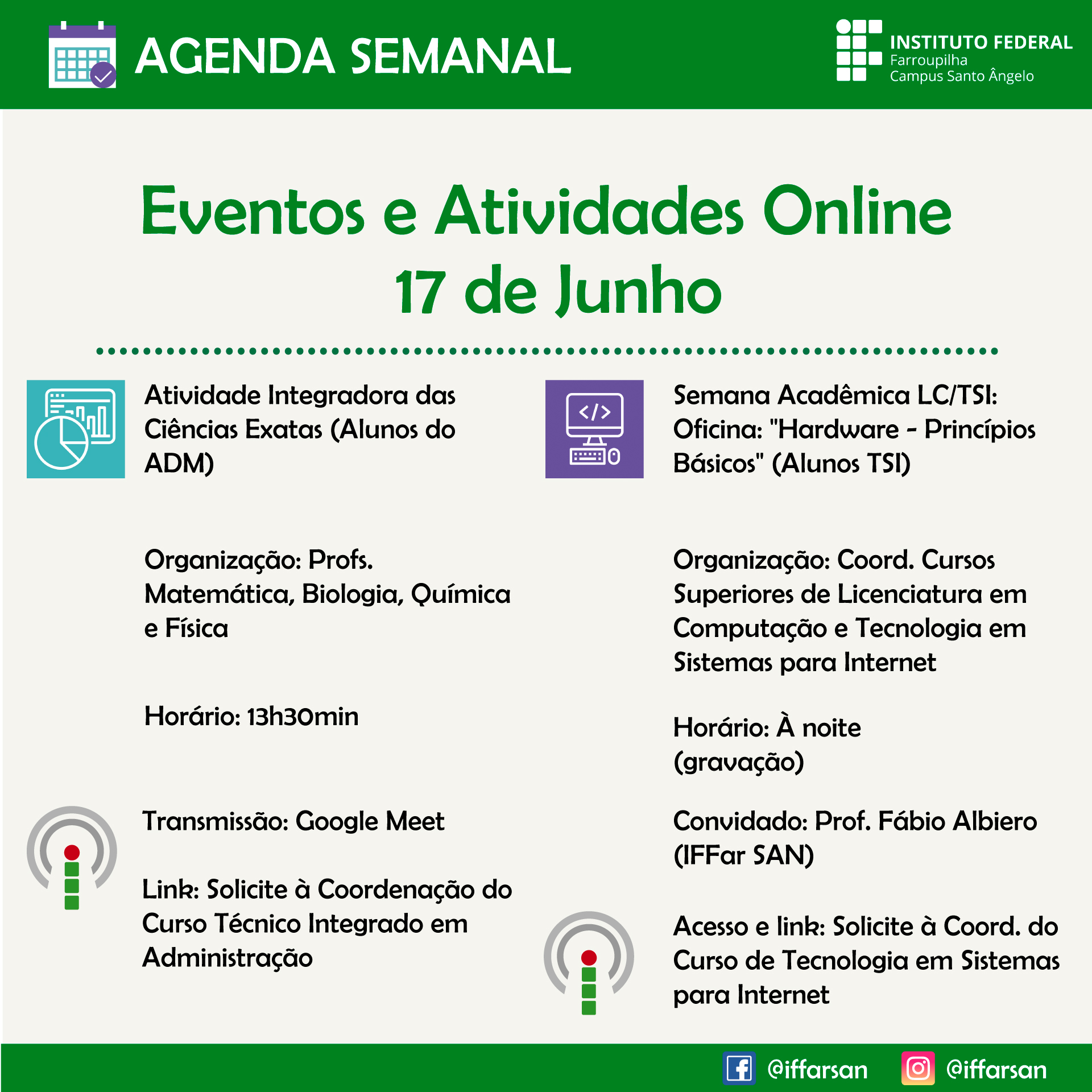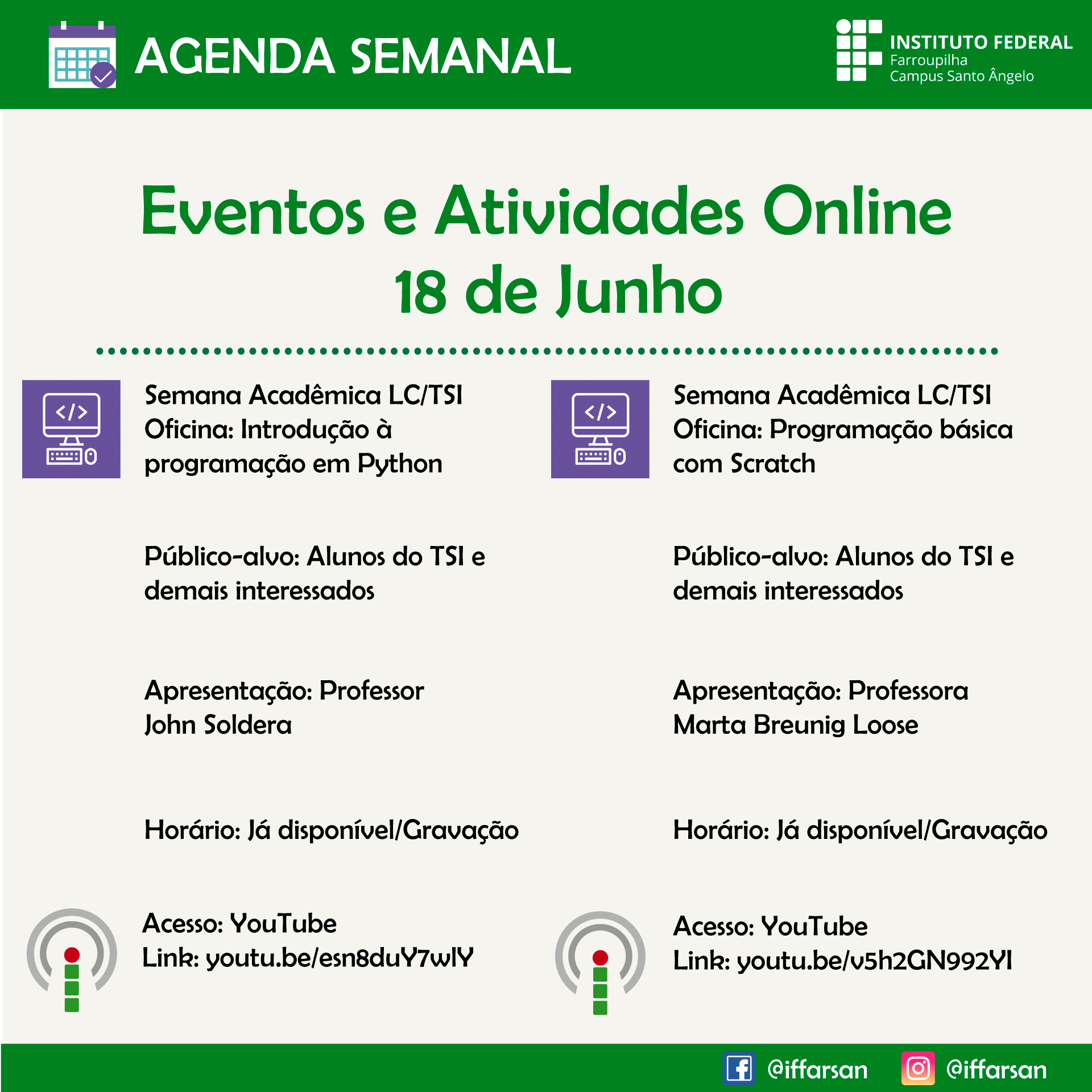 Fique por dentro da programação por meio do nosso site e redes sociais no Facebook e Instagram (@iffarsan).