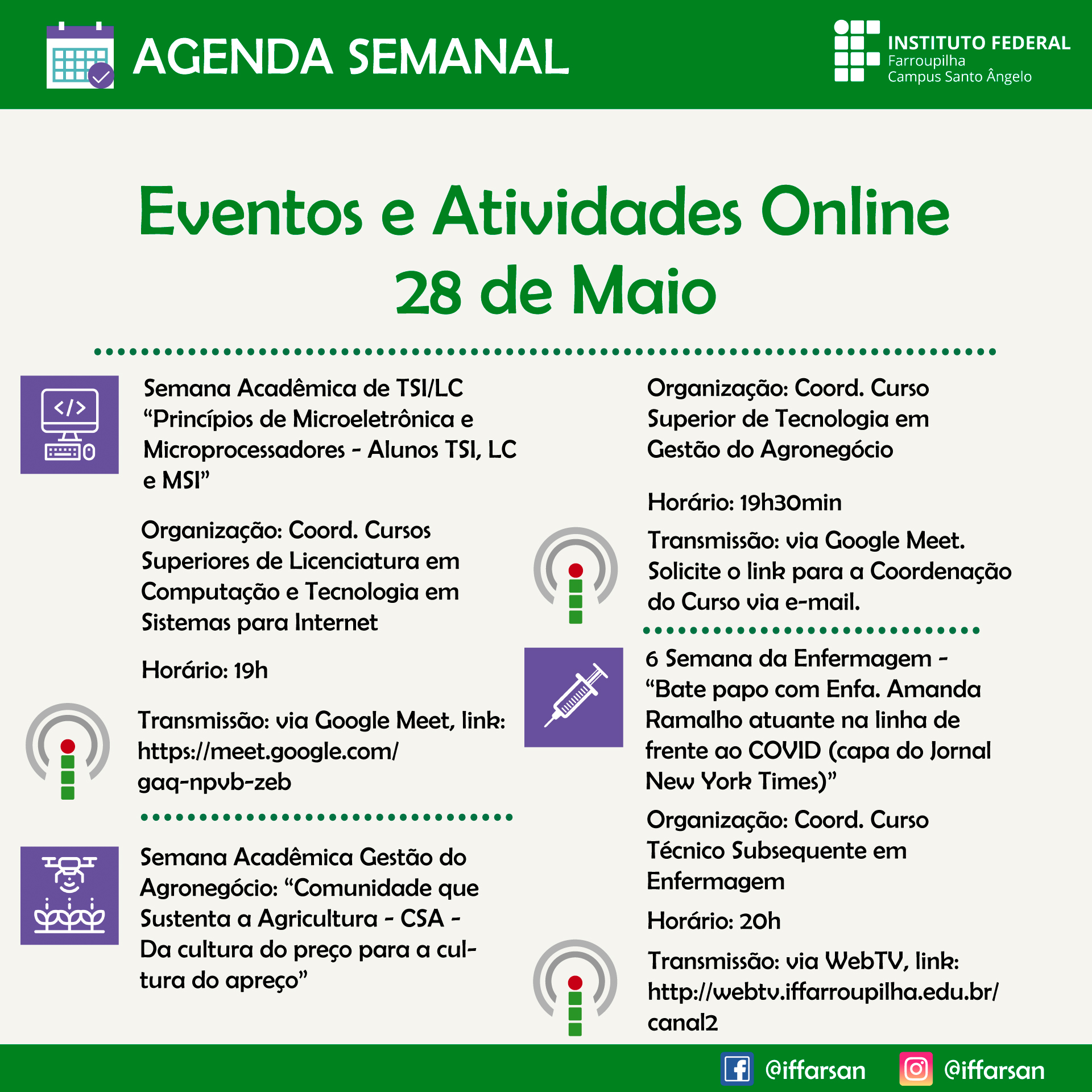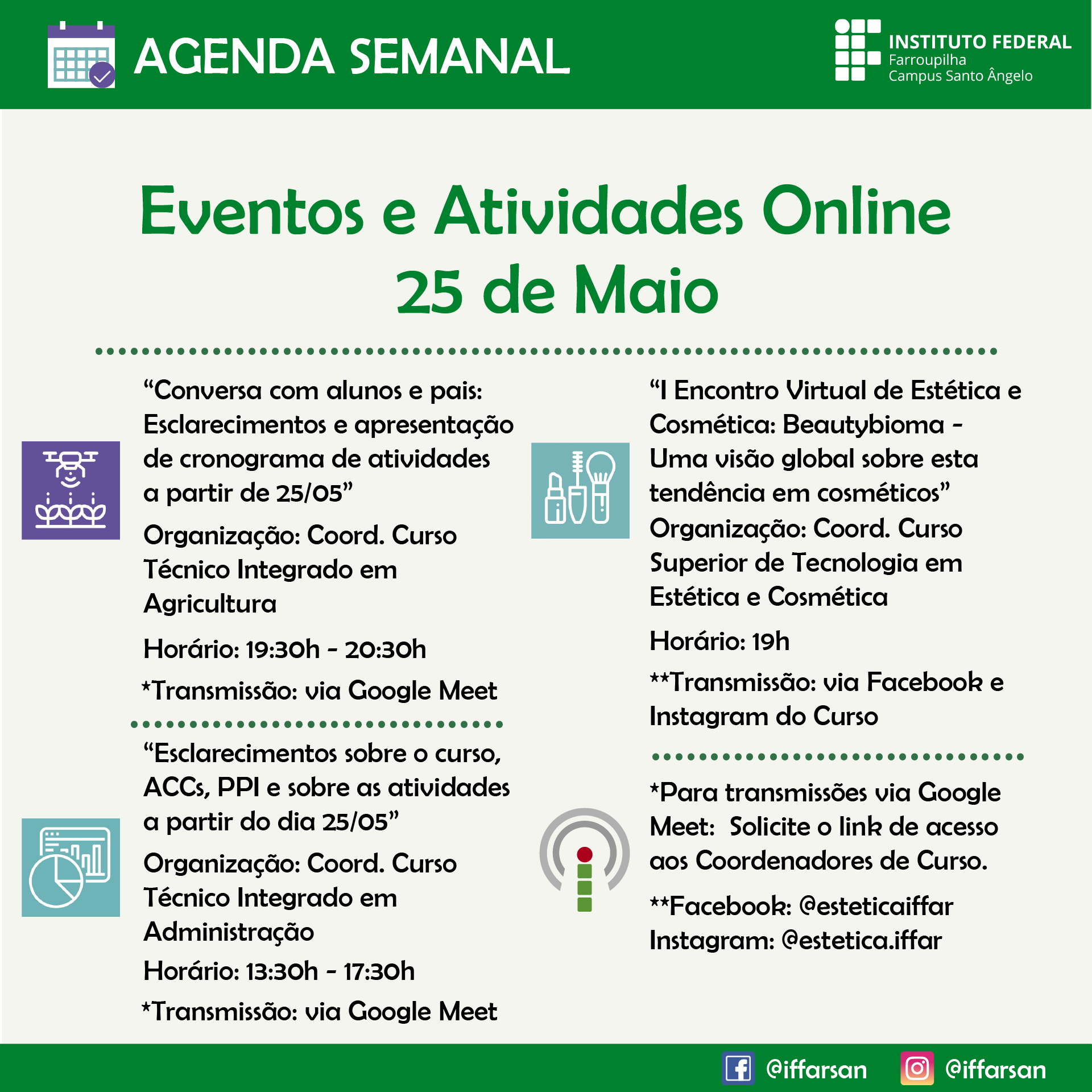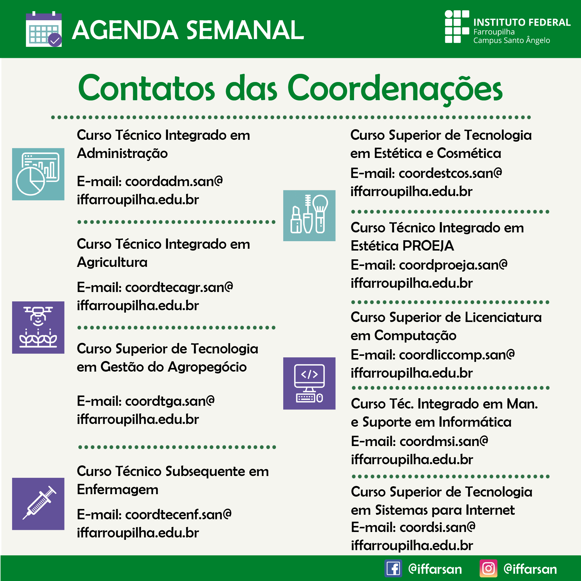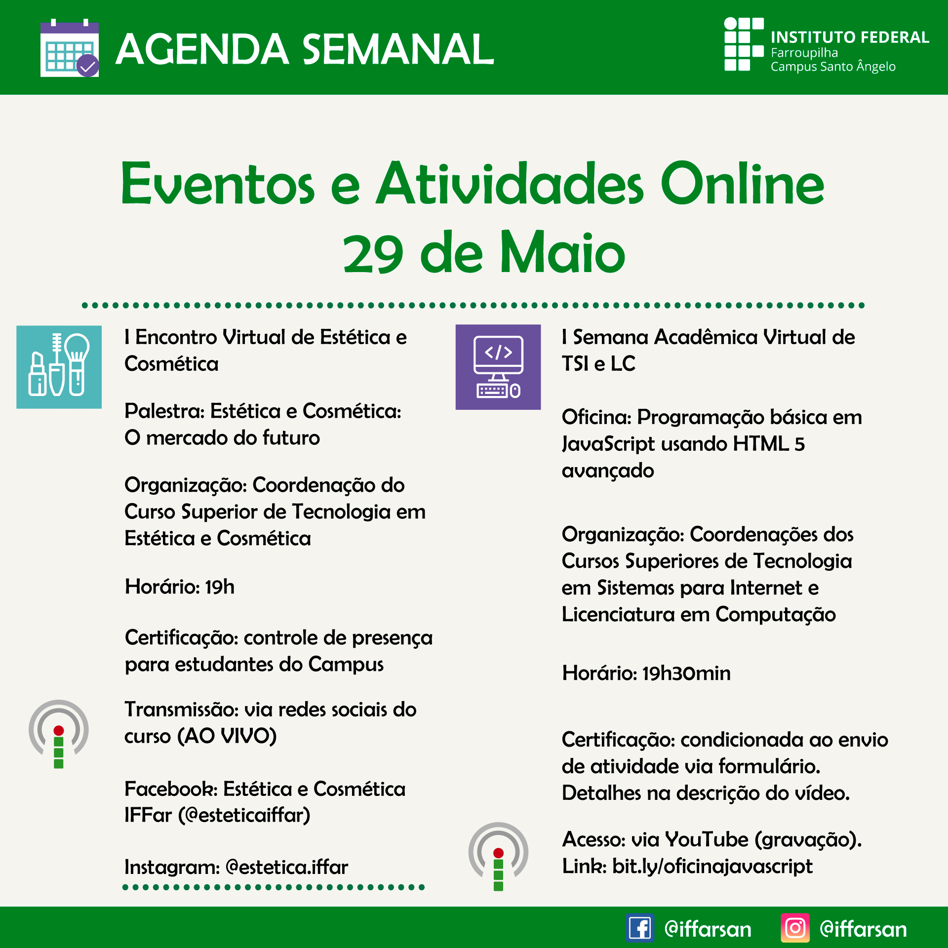 Fique por dentro da programação por meio do nosso site e redes sociais no Facebook e Instagram (@iffarsan).