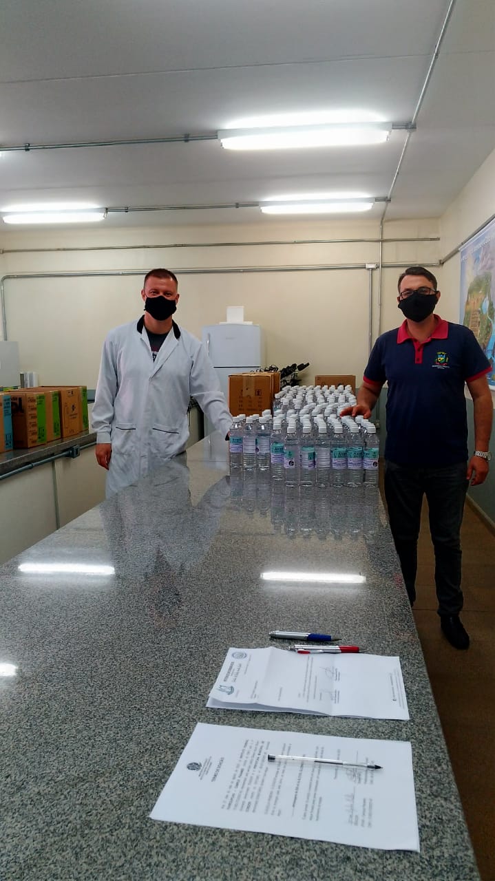 Hoje, 27/08, a produção de álcool glicerinado 80% foi destinada aos municípios vizinhos de Condor e Santa Bárbara do Sul. Cada município recebeu a doação de 420 unidades de álcool, sendo 400 destinadas às Prefeituras Municipais e 20 unidades para a Brigada Militar de cada município.