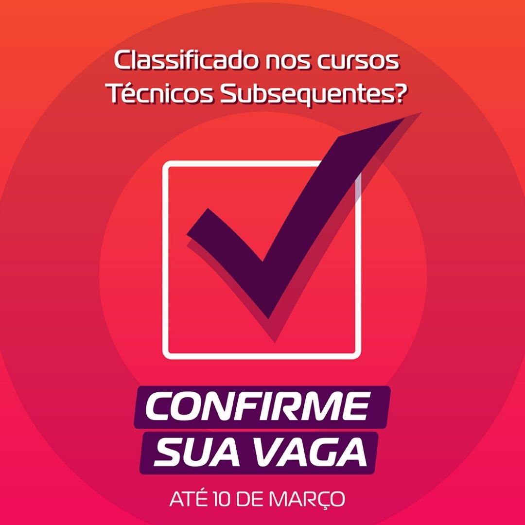Os candidatos classificados em 1ª chamada no Processo Seletivo dos Cursos Técnicos Subsequentes 2021 devem confirmar sua vaga até a próxima quarta-feira, dia 10 de março. A confirmação da vaga é feita de forma online, pelo sistema de inscrição. A documentação necessária varia conforme a cota ou ampla concorrência.