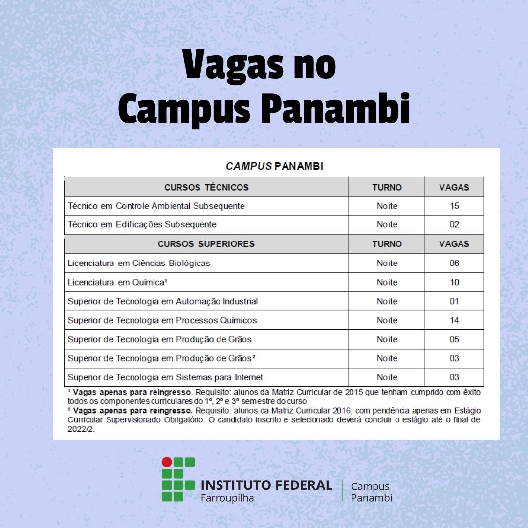 São ofertadas vagas em diversos cursos do Campus Panambi. Para mais informações consulte o Edital 371/2022 disponível em www.iffar.edu.br – Últimos Editais.