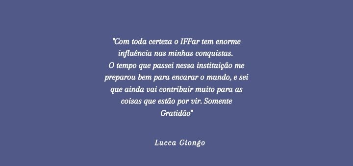“Com toda certeza o IFFar tem enorme influência nas minhas conquistas. O tempo que passei nessa instituição me preparou bem para encarar o mundo, e sei que ainda vai contribuir muito para as coisas que estão por vir. Somente Gratidão!”