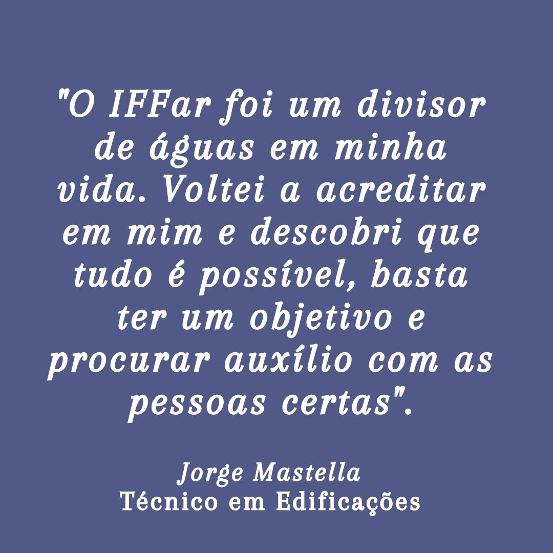 O egresso considera que “Essa oportunidade de estudar e me formar Técnico em Edificações no IFFar abriu novos horizontes em minha vida. Antes eu era um simples pedreiro. Hoje sou um construtor e projetista, em um patamar profissional superior. O IFFar foi um divisor de águas em minha vida. Voltei a acreditar em mim e descobri que tudo é possível, basta ter um objetivo e procurar auxílio com as pessoas certas. Obrigado IFFar!”.