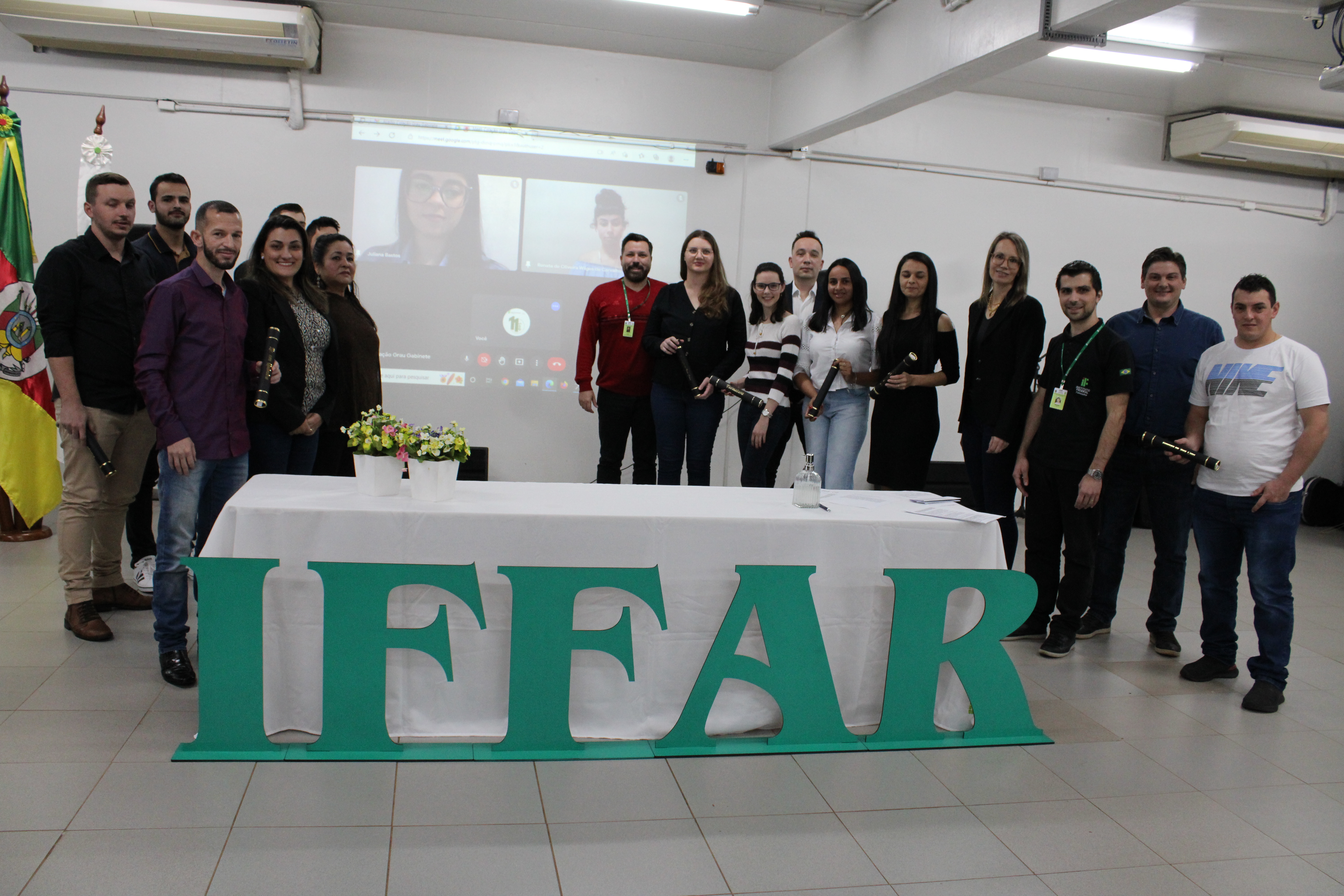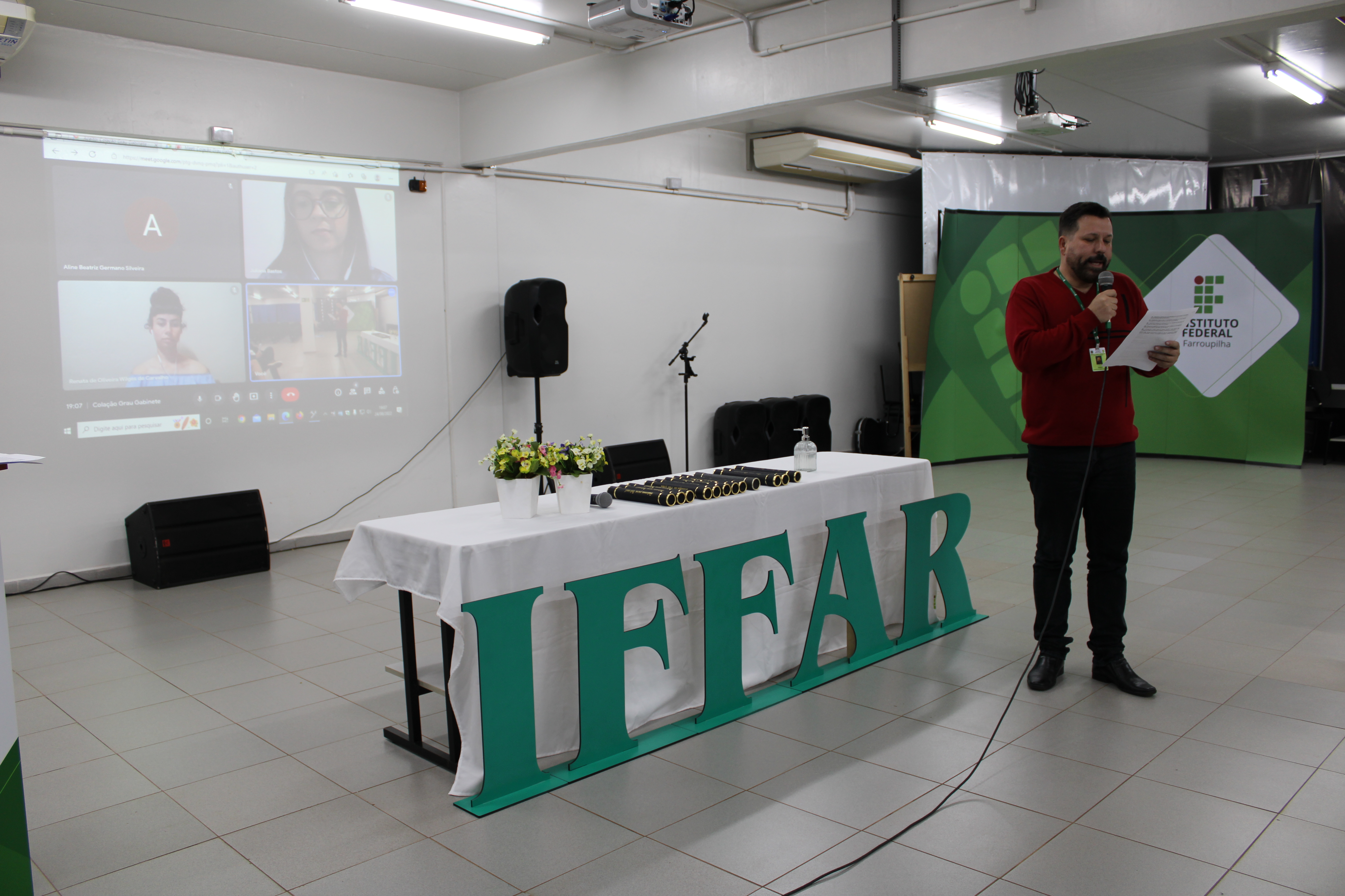 O ato foi realizado no formato híbrido e ocorreu no auditório do Campus, contando com a presença do Diretor Geral, Jorge Alberto Lago Fonseca, e dos coordenadores/coordenadores substitutos dos cursos de Licenciatura em Ciências Biológicas, Licenciatura em Química, Tecnologia em Processos Químicos, Tecnologia em Produção de Grãos e Tecnologia em Sistemas para Internet.