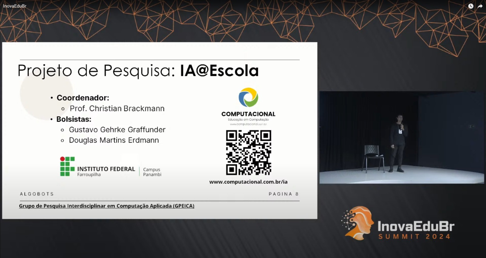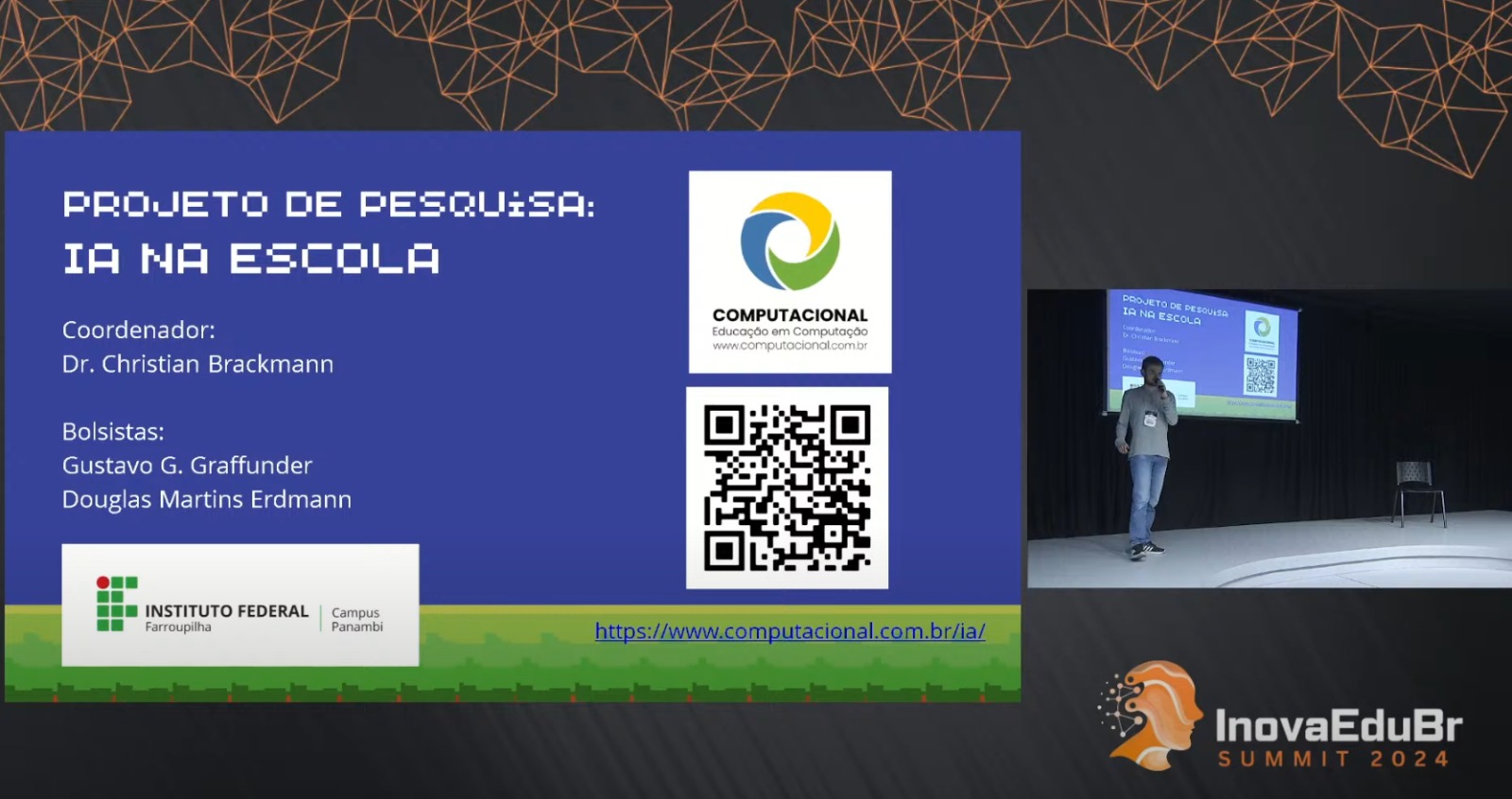 No recente InovaEduBr Summit, sediado em Porto Alegre, no Instituto Caldeira, a convergência entre tecnologia e educação para moldar o futuro foi o centro das atenções. Entre os participantes, os estudantes do Curso Superior de Tecnologia em Sistemas para Internet do Instituto Federal Farroupilha – Campus Panambi, Gustavo Gehrke Graffunder e Douglas Martins Erdmann, destacaram-se ao apresentar o projeto "IA@escola", coordenado pelo professor Dr. Christian Brackmann.