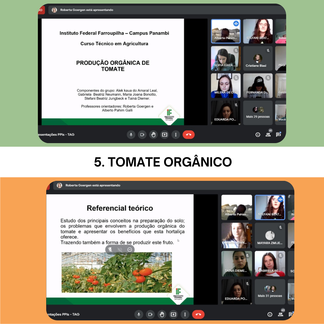 - Um dos grupos teve por objetivo fazer um levantamento bibliográfico sobre a composição nutricional e segurança alimentar de produtos agrícolas produzidos no sistema orgânico, bem como, fazer um planejamento de um ensaio prático com a cultura do tomateiro comparando o cultivo orgânico e convencional. O levantamento bibliográfico levará em conta, principalmente aspectos relacionados as concentrações de vitaminas e minerais dos produtos orgânicos e convencionais, sendo que o ensaio a campo irá comparar a composição de tomates produzidos nos dois sistemas, buscando mostrar, na prática, estas diferenças.
