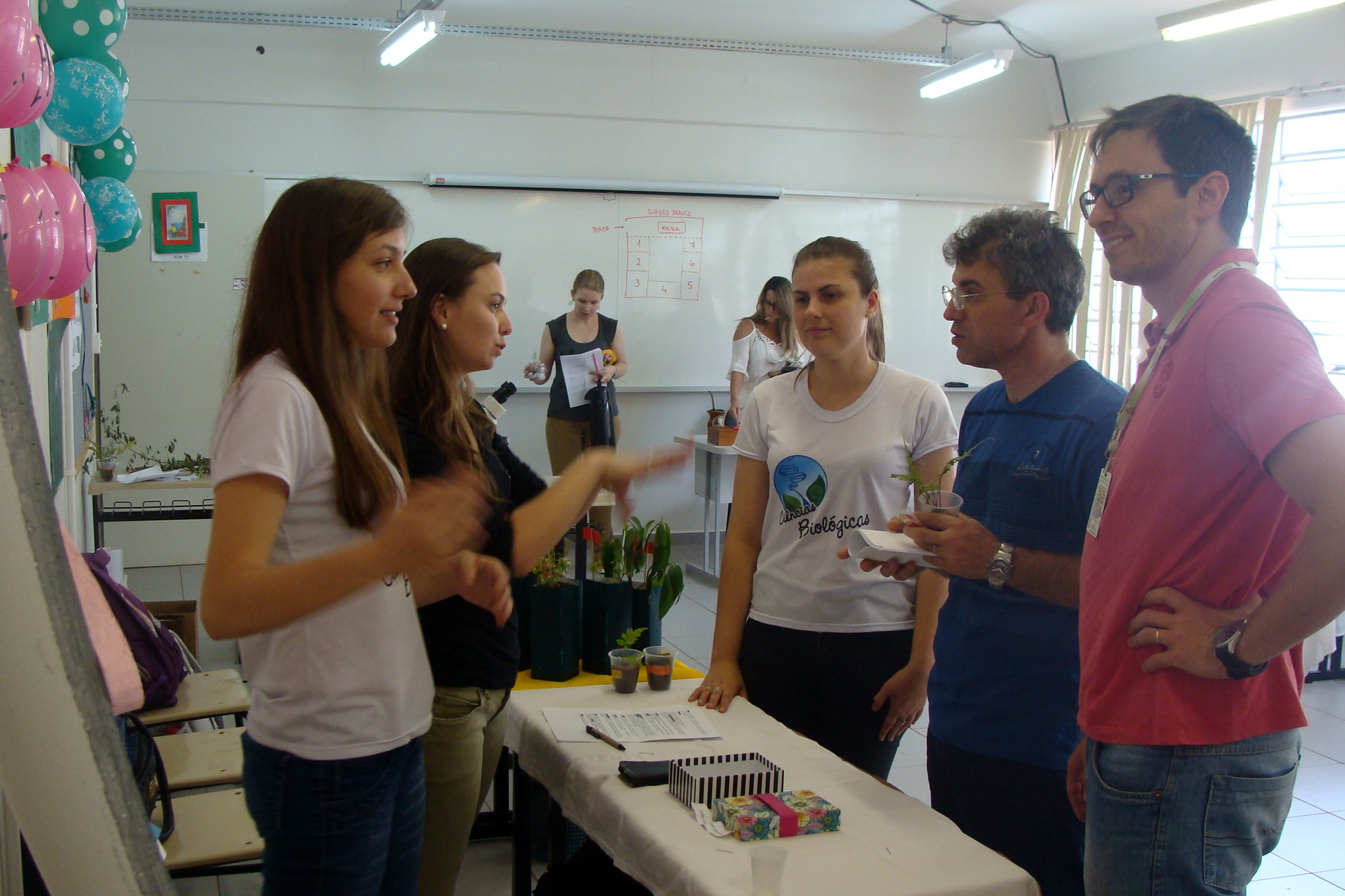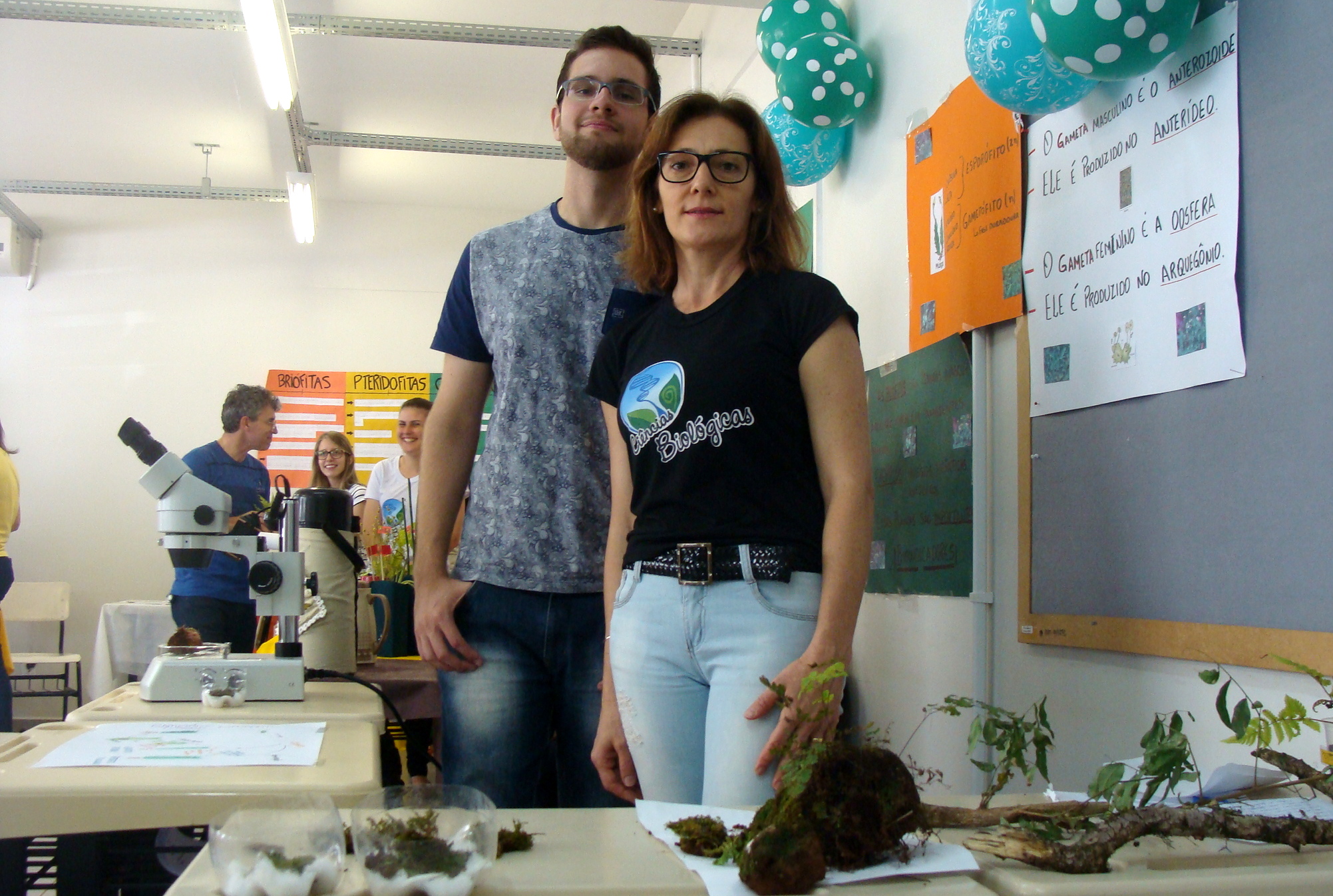 Alunos do superior em Biologia apresentando para os alunos do médio