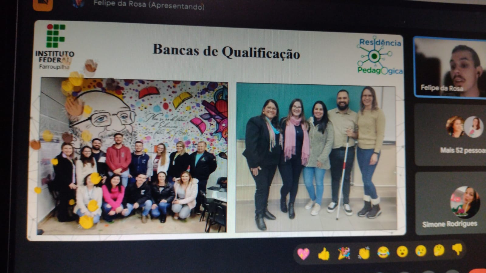 O encerramento desse importante ciclo contou com a presença dos alunos residentes; das coordenações dos cursos envolvidos; das docentes que atuaram na orientação dos Trabalhos de Conclusão de Residência; do Diretor Geral do IFFar – Campus Panambi, Jorge Alberto Lago Fonseca; da Coordenadora local do Programa, Aline Machado Zancanaro; da Coordenadora Institucional dos Programas Educacionais do IFFar, Maria Rosângela Ramos; da representante da Pró-Reitora de Ensino do IFFar, Andriéli Hedlund Bandeira; e da Coordenadora Institucional do Pibid/IFFar, Patrícia Perlin.