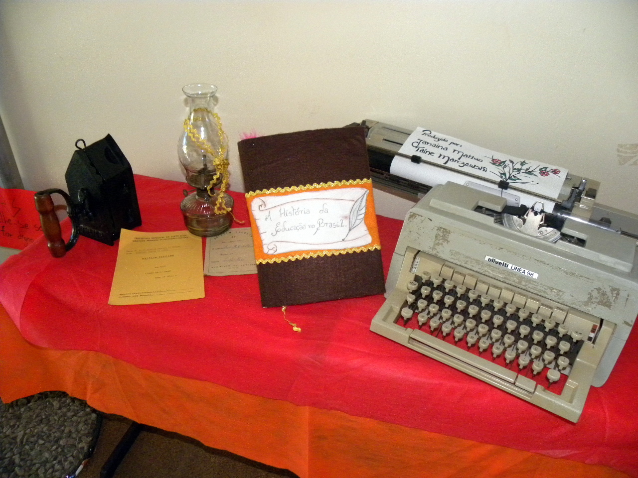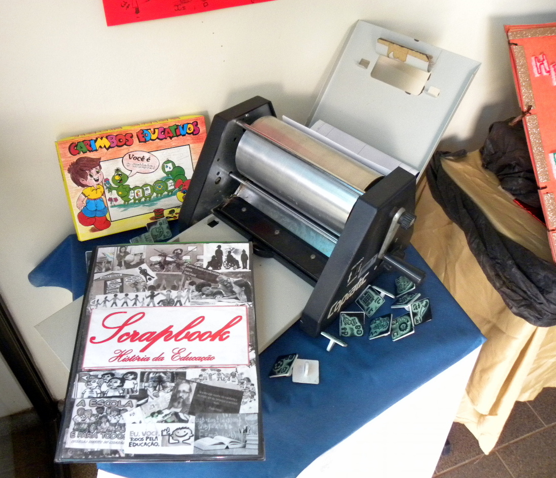 Os objetos fazem parte da exposição dos trabalhos produzidos pelos alunos da 2ª turma da Licenciatura em Ciências Biológicas a partir do estudo da disciplina História da Educação Brasileira. Os alunos foram desafiados a sistematizar os conhecimentos construídos por meio de um scrapbook, ou livro de recortes, também expostos no saguão.