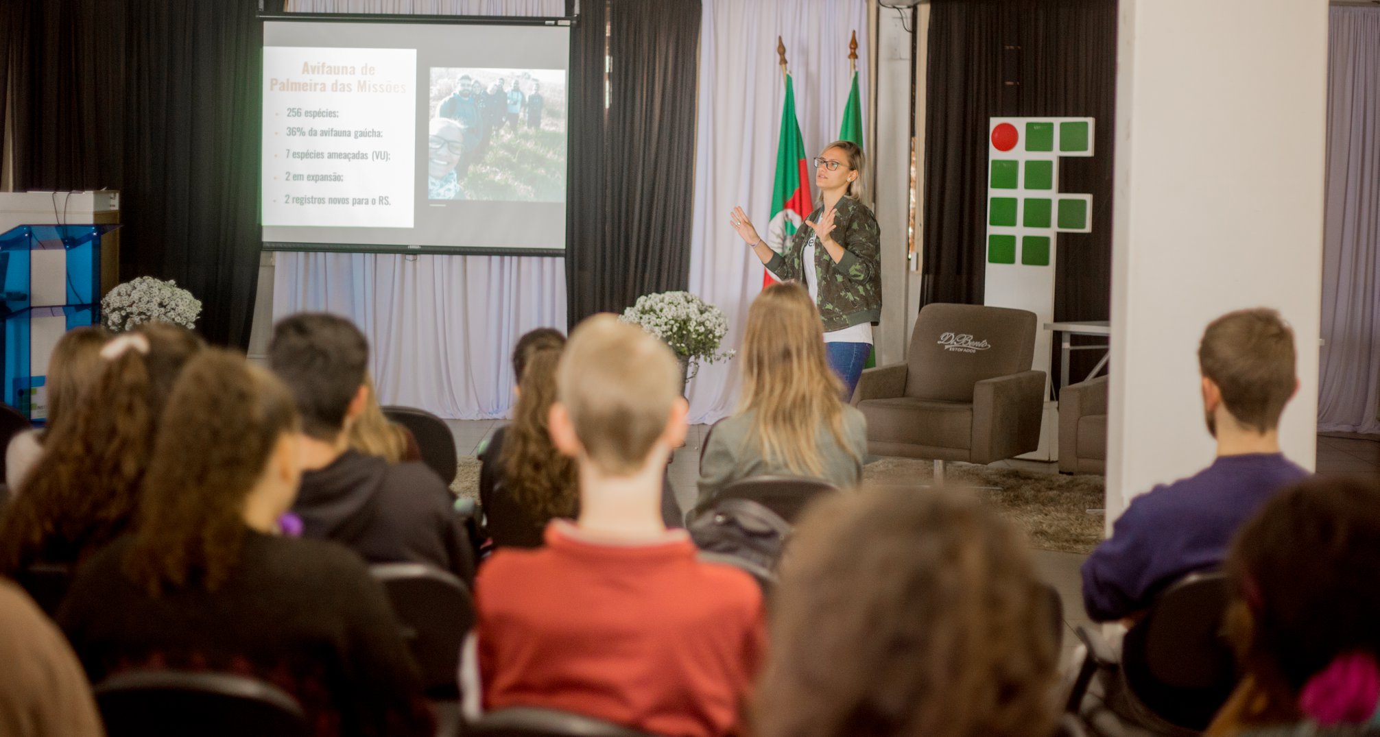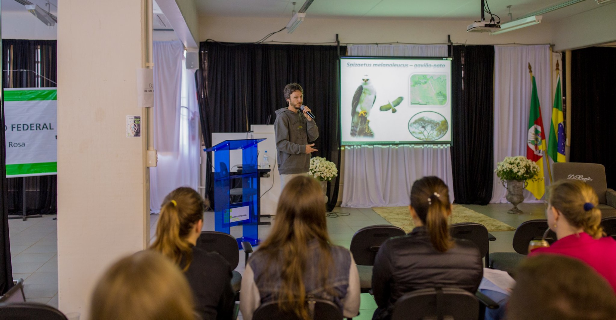 Após, o biólogo e ornitólogo Dante Meller, membro do projeto Harpia, palestrou sobre as águias brasileiras do Rio Grande do Sul. Ele falou sobre o seu trabalho de doutorado, desenvolvido no Parque Estadual do Turvo, buscando estudar a nidificação de tais espécies em território gaúcho.