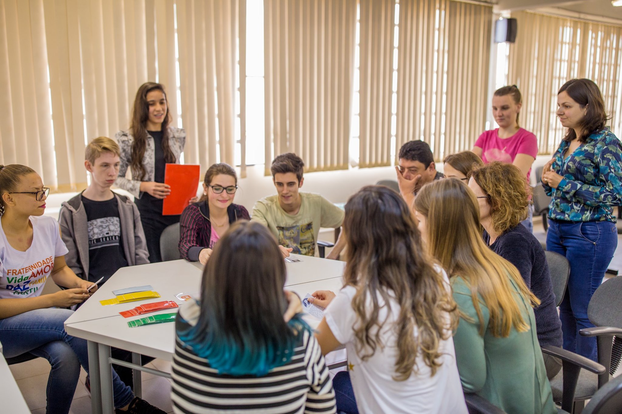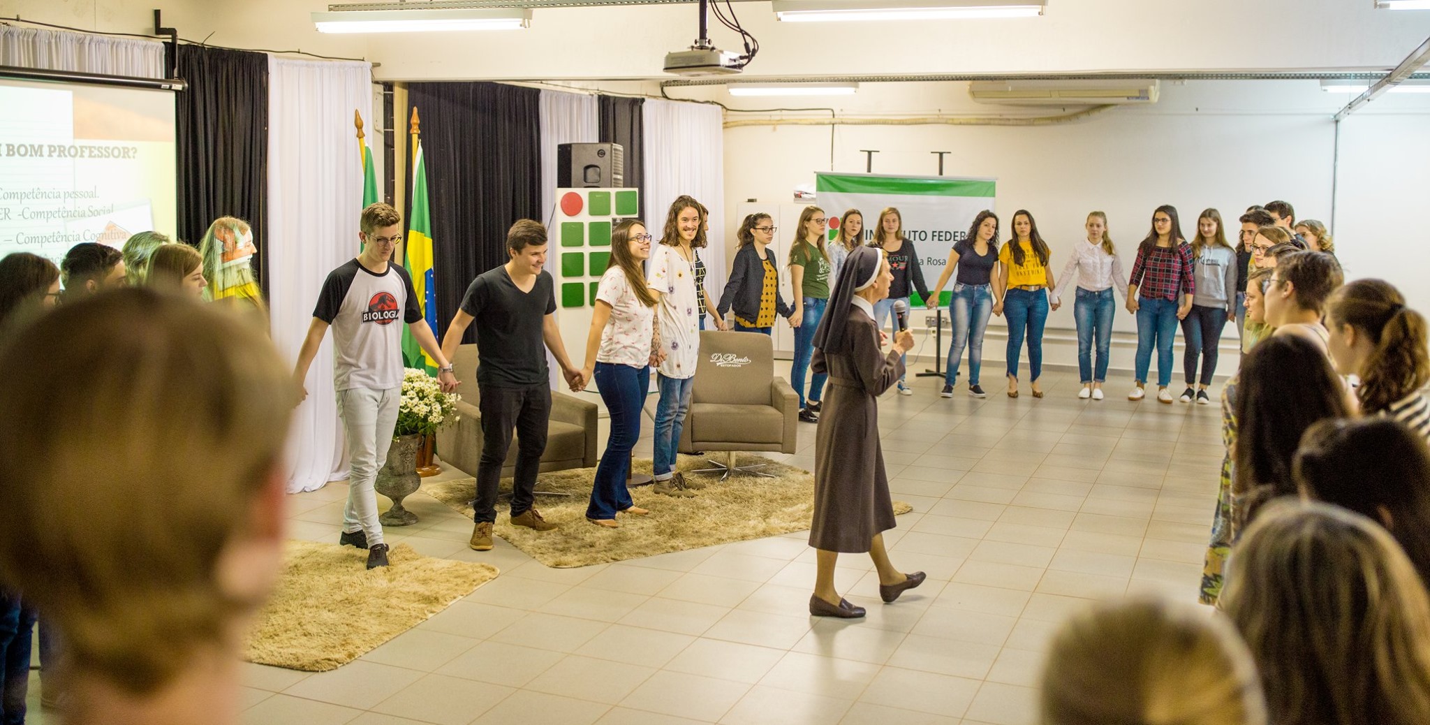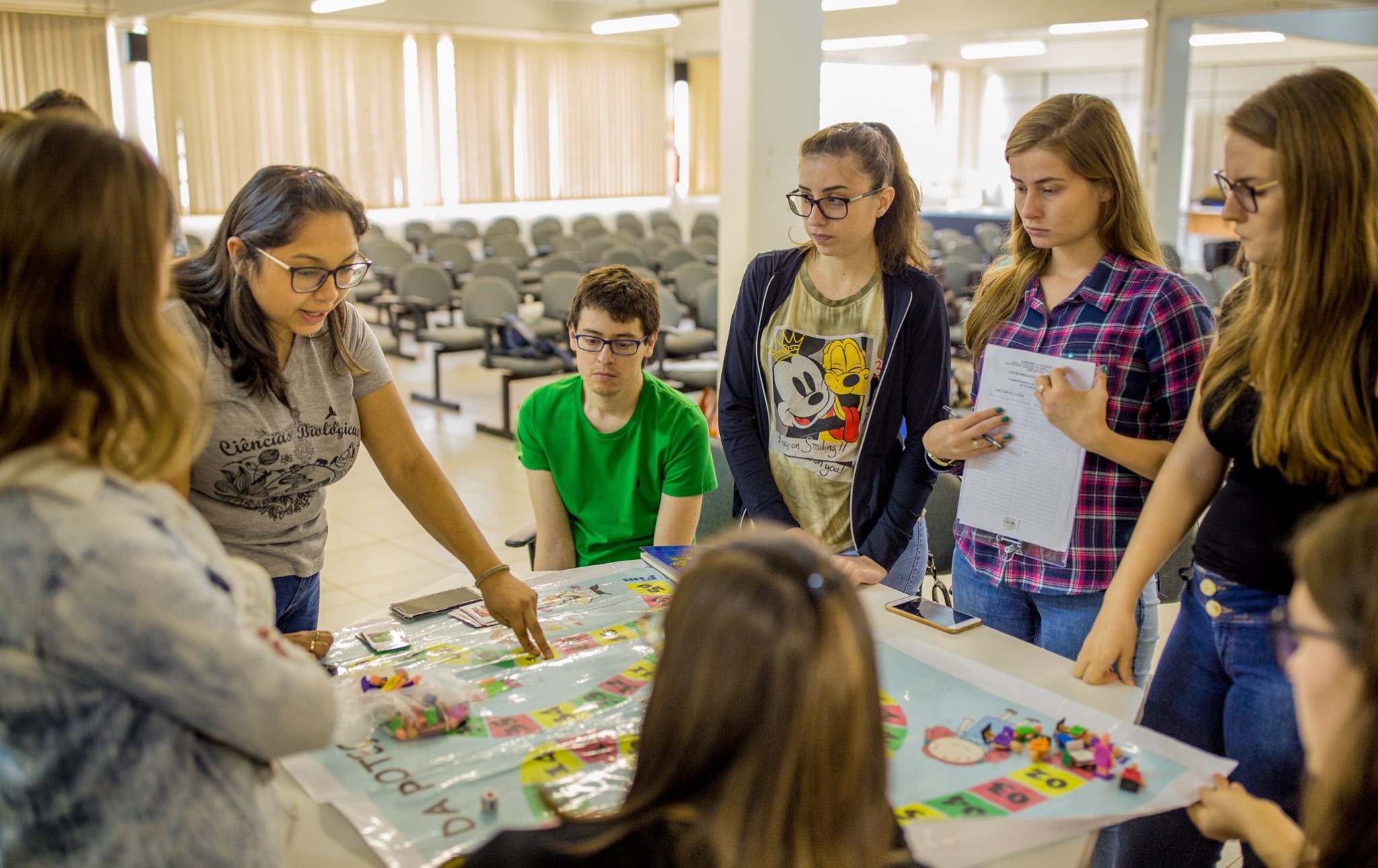 As atividades foram realizadas no Ginásio do campus e integraram as disciplinas de Matemática e Biologia. “Foram organizadas 10 estações, sendo 3 específicas da Biologia, 3 da Matemática e 4 contemplando conhecimentos de Biologia e Matemática”, explica a professora de Biologia, Michele Brodt. “Organizamos equipes mistas por cores, propiciando a integração de diferentes turmas e escolas nas dinâmicas”.