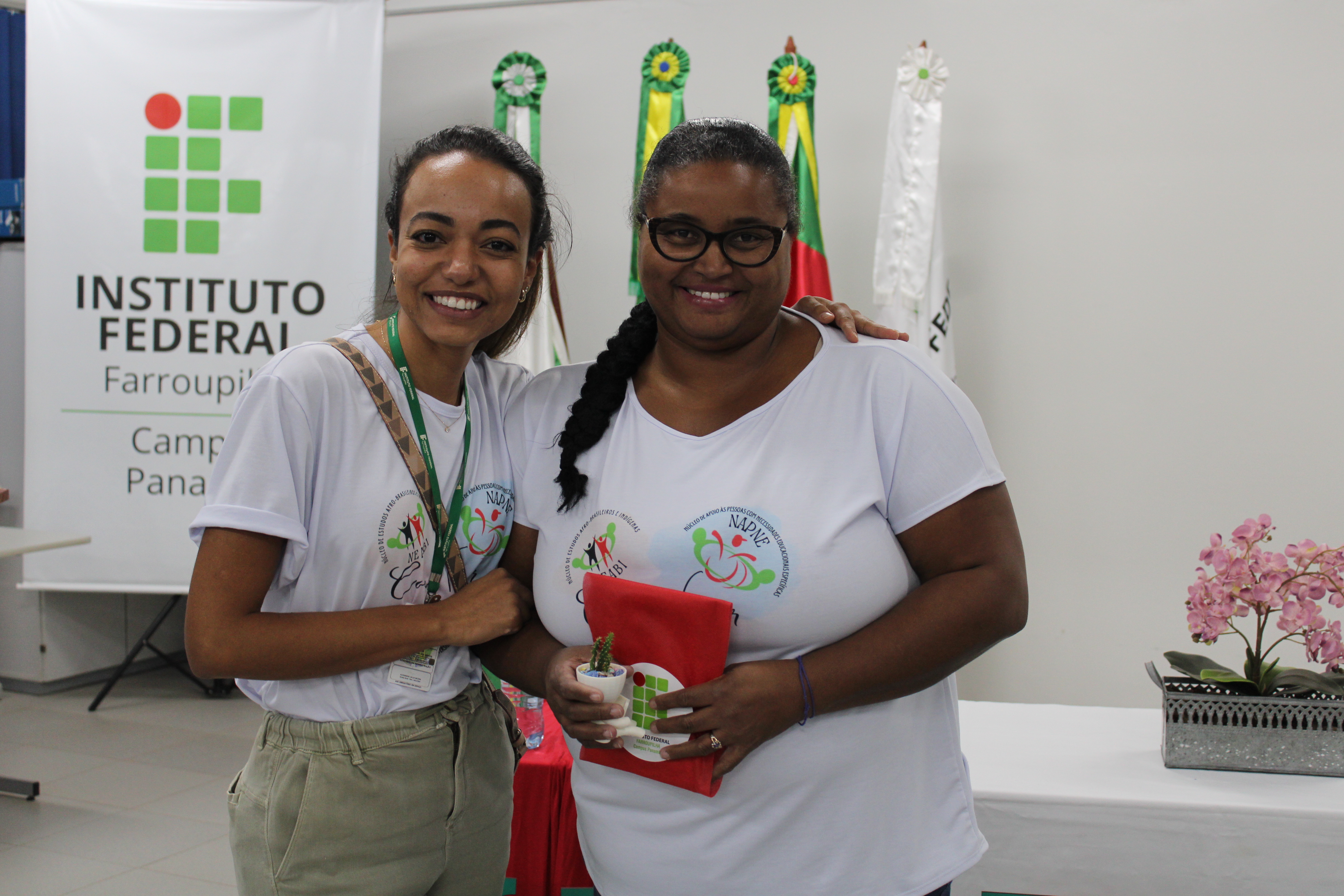 Esp. Michele Fernanda Silveira da Silveira e Estudante Weliton da Silva Bólico (Núcleo Estudos Afro-Brasileiros e Indígenas - NEABI) Ainda contribuiu na segunda rodada de discussões a professora Drª. Carla Tatiana Zappe que compartilhou a experiência de atuação na Coordenação de Atendimento à Pessoa com Necessidades Educacionais Específicas (PROEN, IFFar).