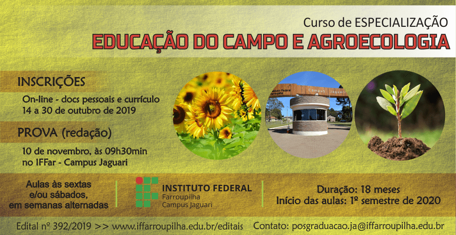 De 14 a 30 de outubro estarão abertas as inscrições para o Curso de Pós-Graduação Lato Sensu - Especialização em Educação do Campo e Agroecologia do IFFar - Campus Jaguari.